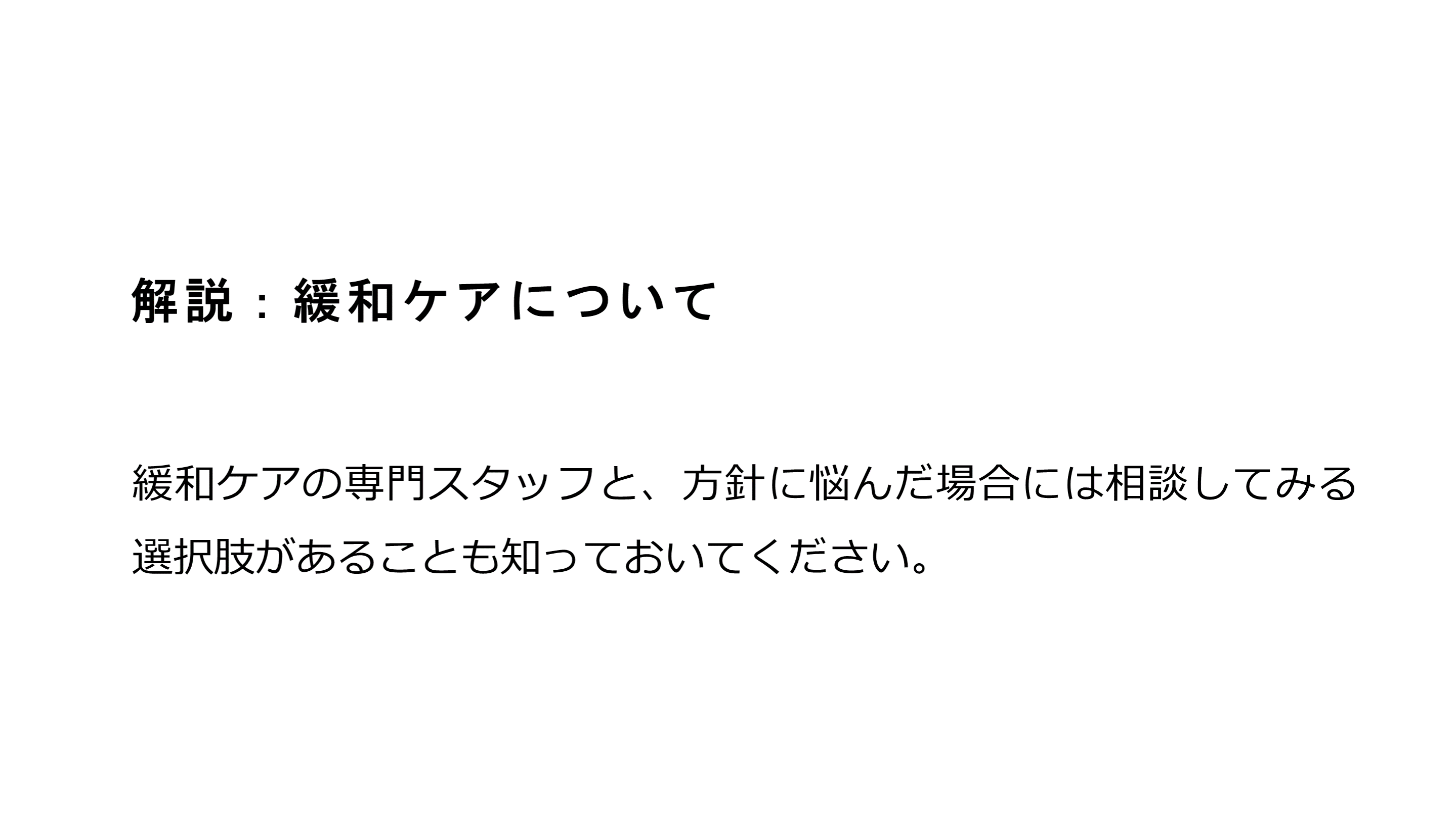 #67. 解説:緩和ケアについて 緩和ケアの専門スタッフと、方針に悩んだ場合には相談してみる選択肢があることも知っておいてください。