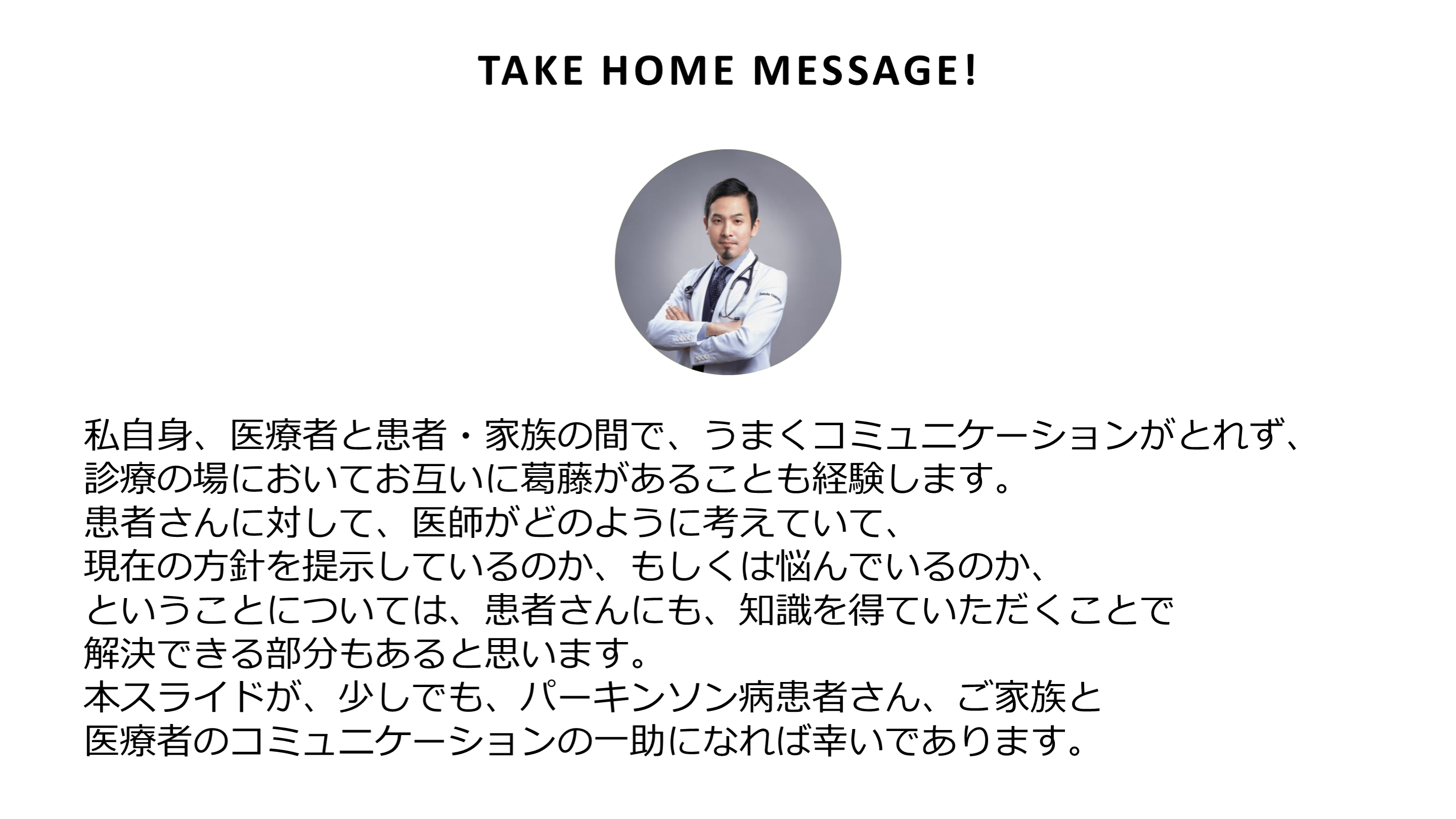 医療者のコミュニケーションの一助になれば幸いであります。 TAKE HOME MESSAGE!