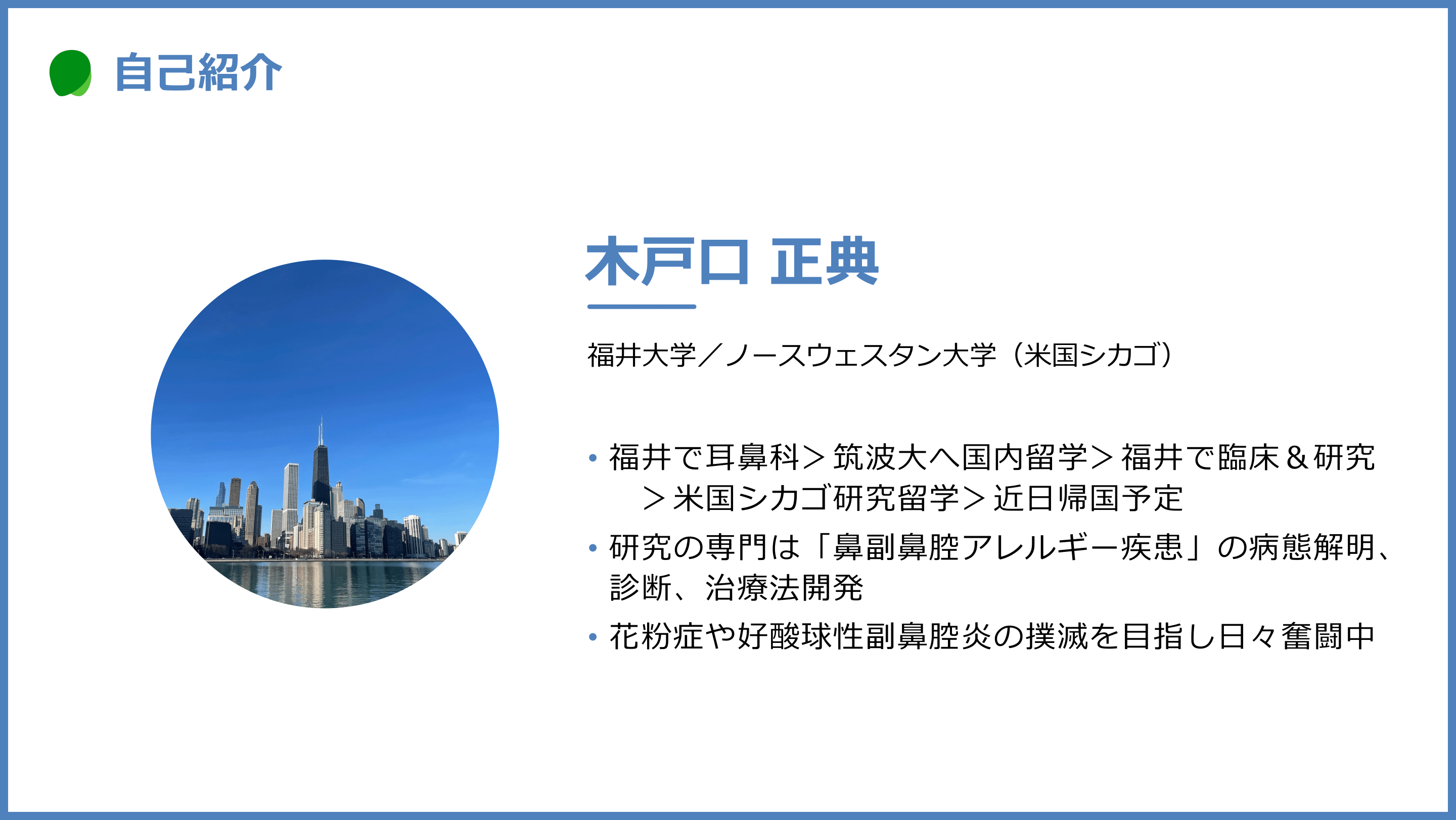 #2. ⾃⼰紹介 ⽊⼾⼝ 正典 福井⼤学/ノースウェスタン⼤学(⽶国シカゴ) • 福井で⽿⿐科>筑波⼤へ国内留学>福井で臨床&研究 >⽶国シカゴ研究留学>近⽇帰国予定 • 研究の専⾨は「⿐副⿐腔アレルギー疾患」の病態解明、 診断、治療法開発 • 花粉症や好酸球性副⿐腔炎の撲滅を⽬指し⽇々奮闘中