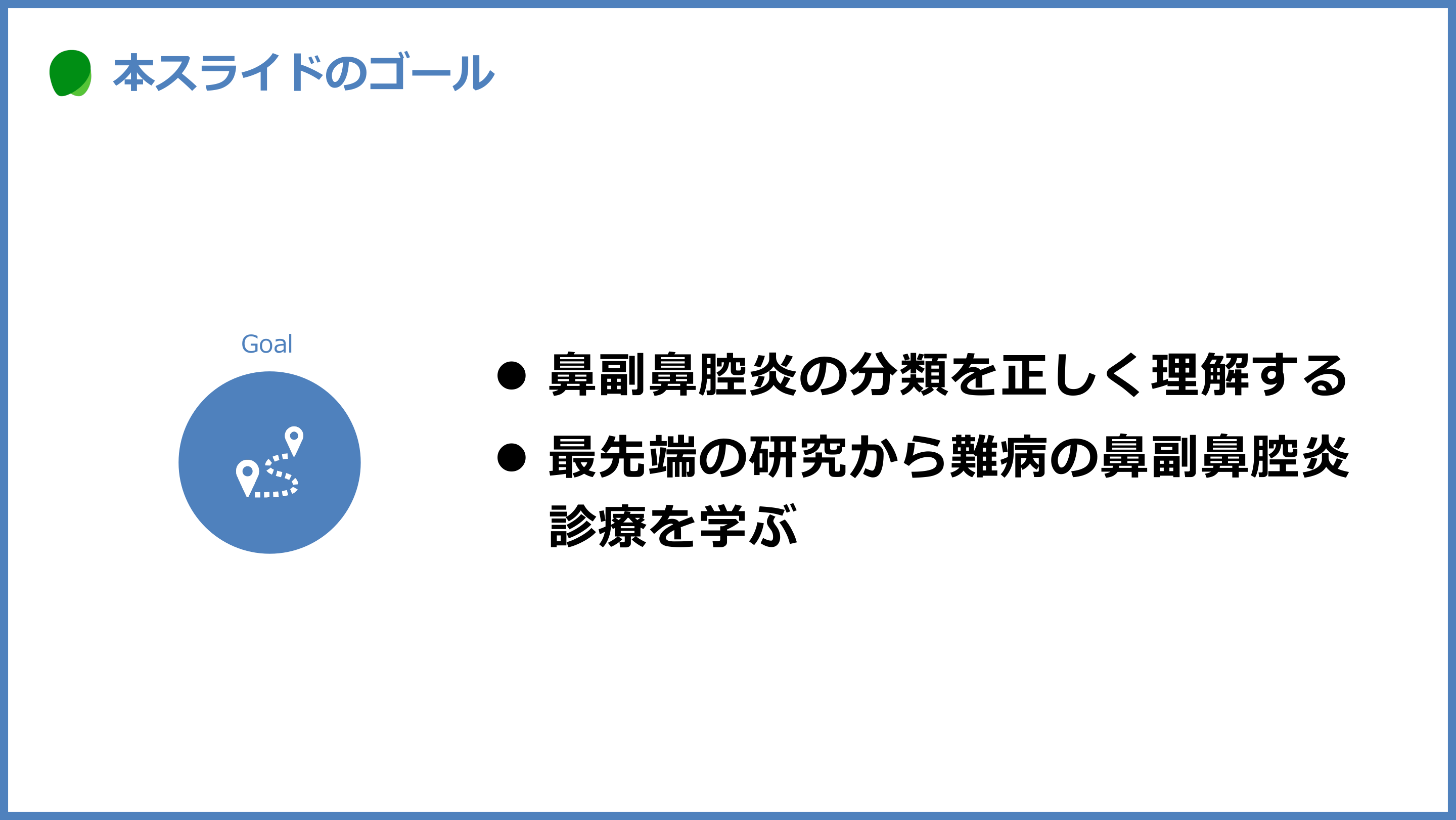 #3. 本スライドのゴール Goal l ⿐副⿐腔炎の分類を正しく理解する l 最先端の研究から難病の⿐副⿐腔炎 診療を学ぶ