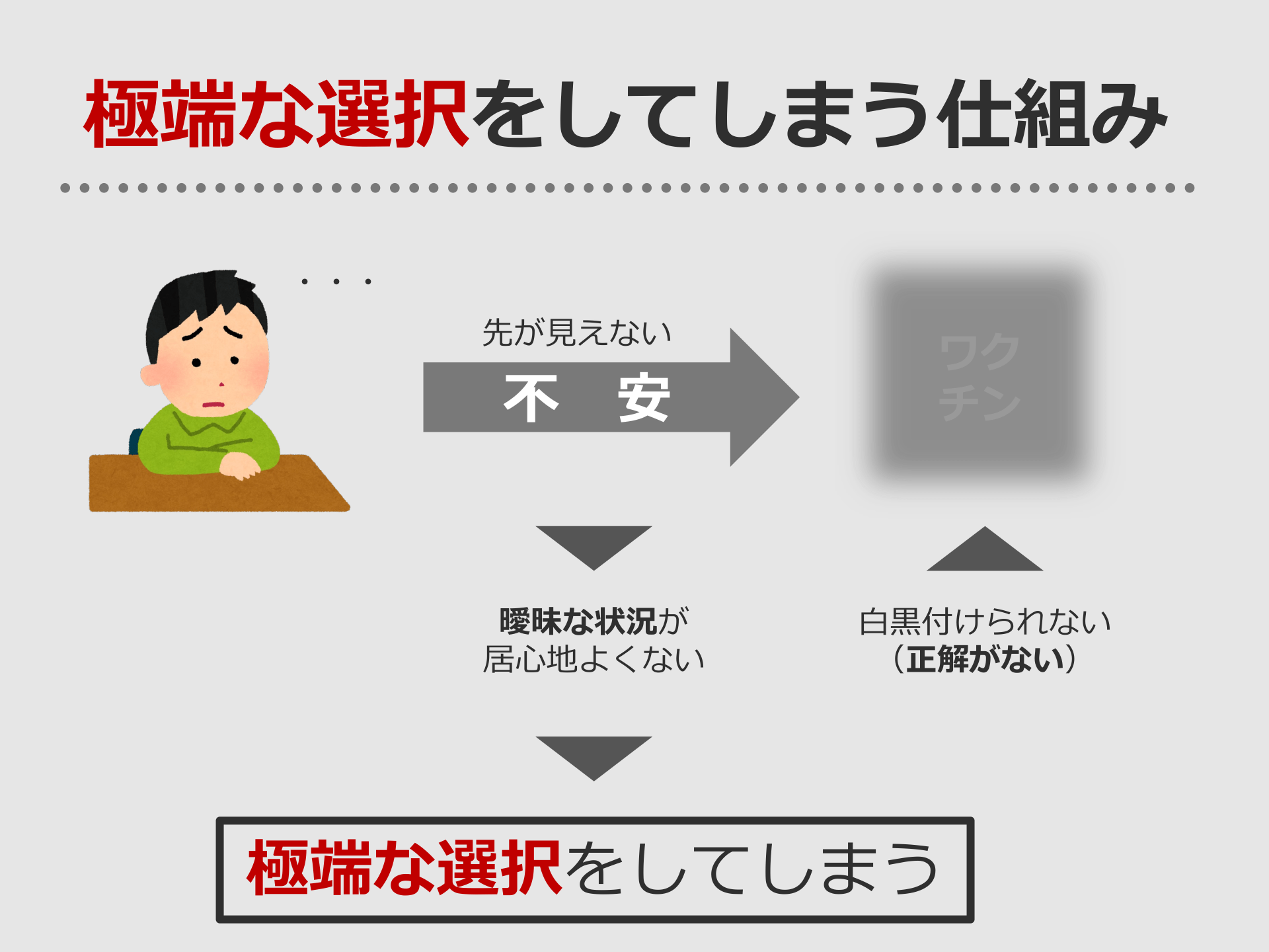 #106. 極端な選択をしてしまう仕組み ・・・ 先が見えない 不 安 曖昧な状況が 居心地よくない ワク チン 白黒付けられない (正解がない) 極端な選択をしてしまう