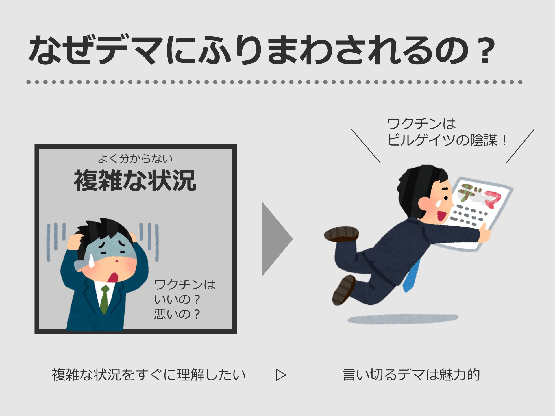 #107. なぜデマにふりまわされるの? ワクチンは ビルゲイツの陰謀! よく分からない 複雑な状況 ワクチンは いいの? 悪いの? 複雑な状況をすぐに理解したい ▷ 言い切るデマは魅力的