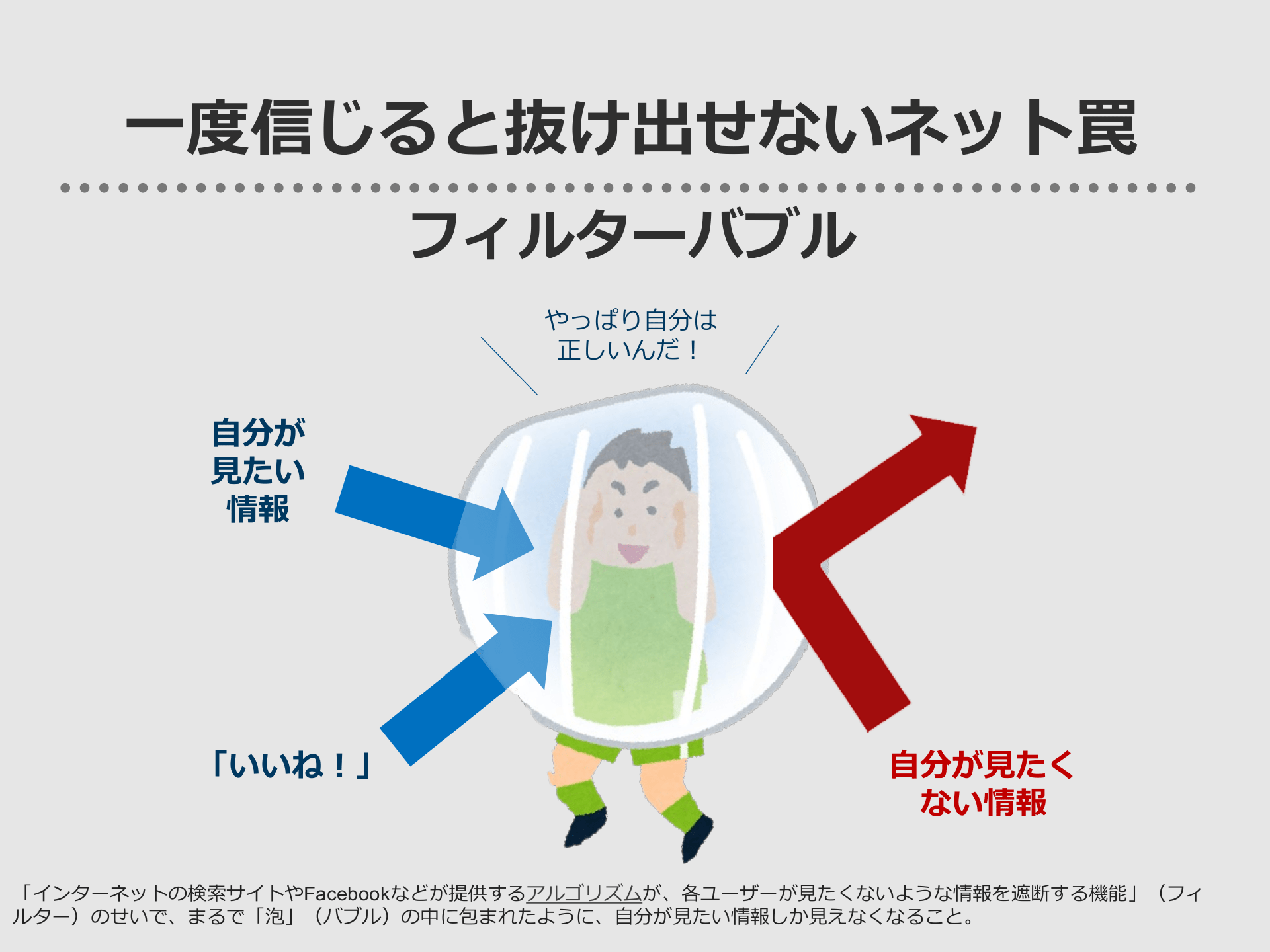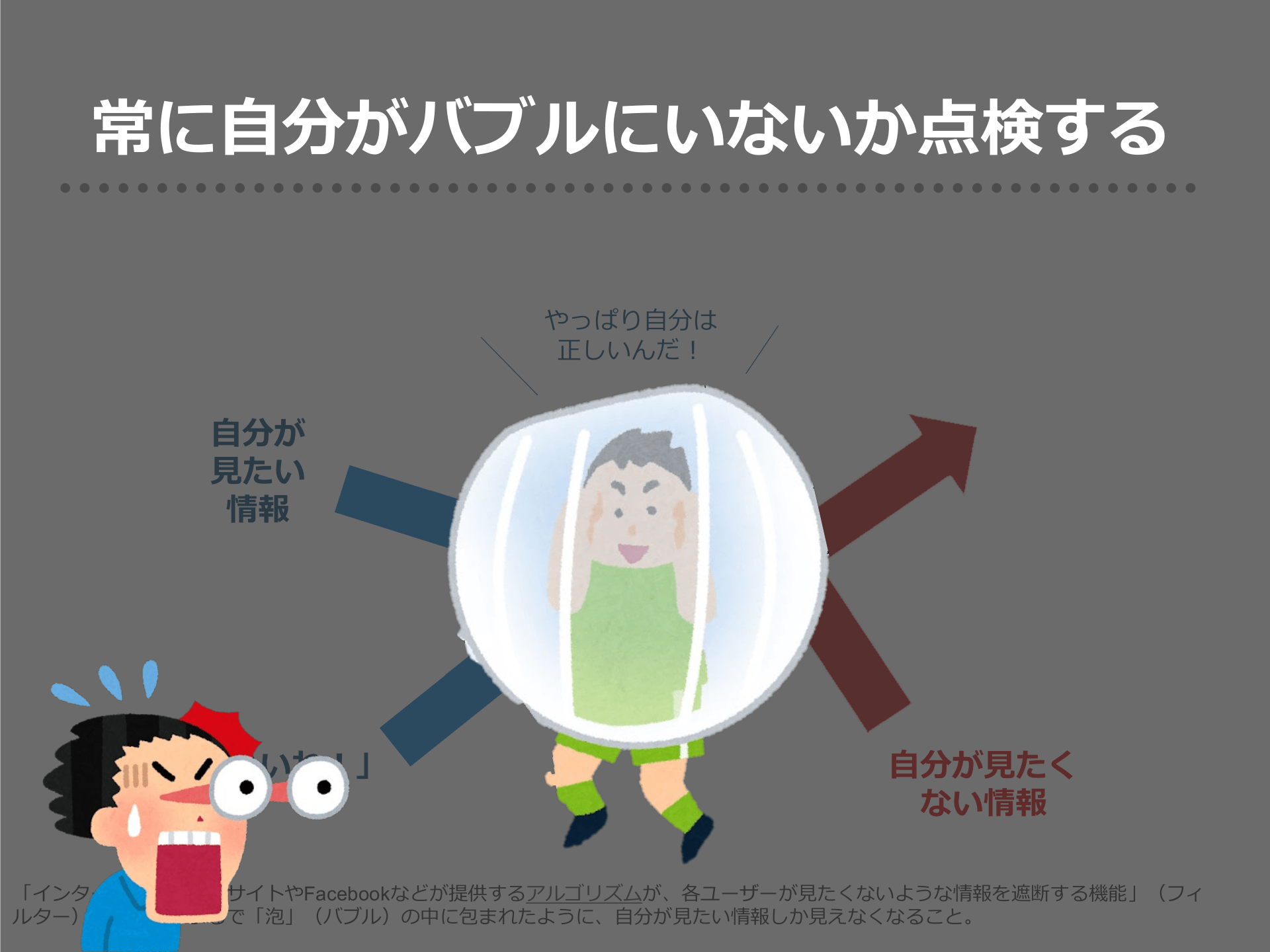 #110. 常に自分がバブルにいないか点検する やっぱり自分は 正しいんだ! 自分が 見たい 情報 「いいね!」 自分が見たく ない情報 「インターネットの検索サイトやFacebookなどが提供するアルゴリズムが、各ユーザーが見たくないような情報を遮断する機能」(フィ ルター)のせいで、まるで「泡」(バブル)の中に包まれたように、自分が見たい情報しか見えなくなること。