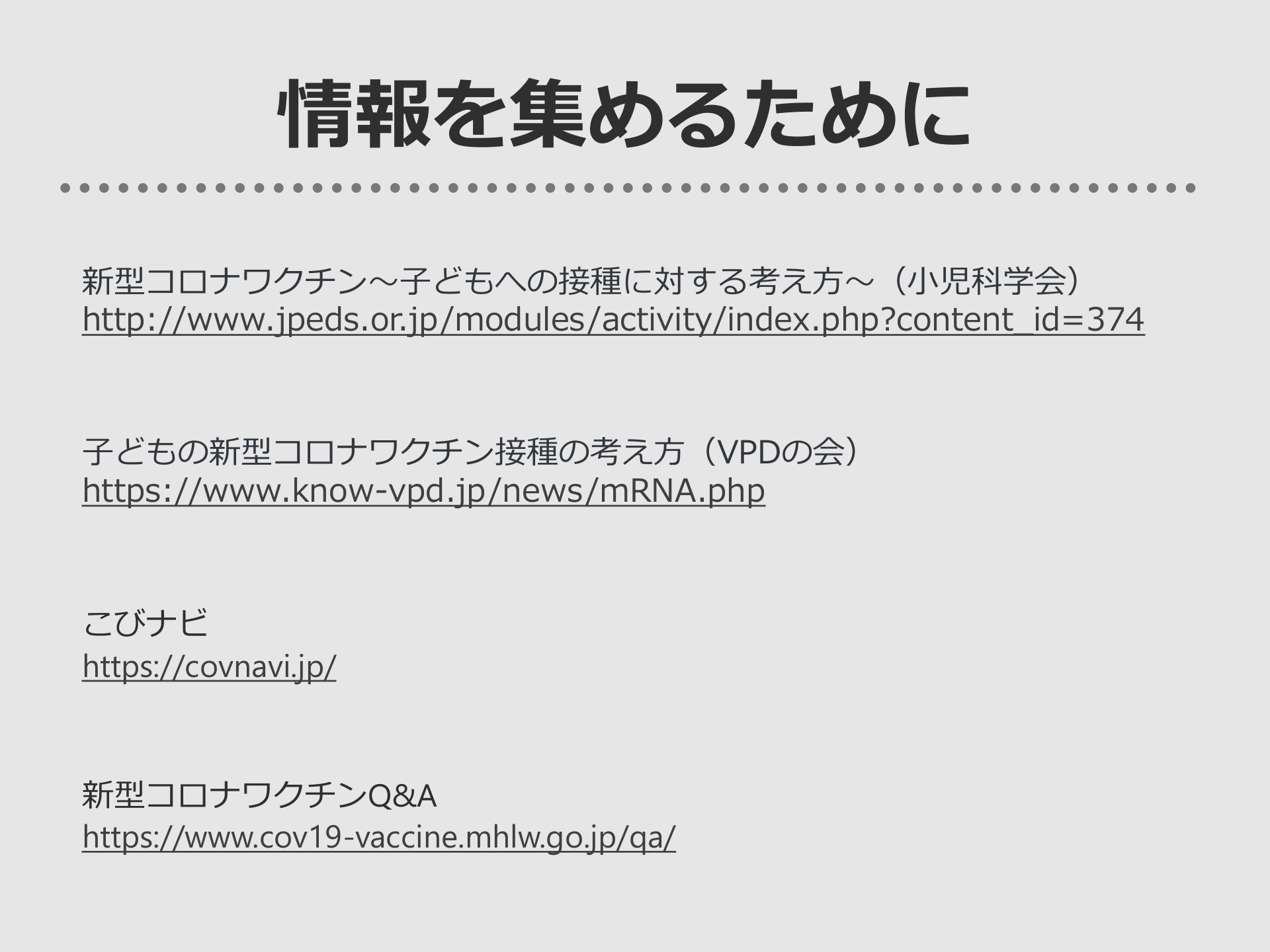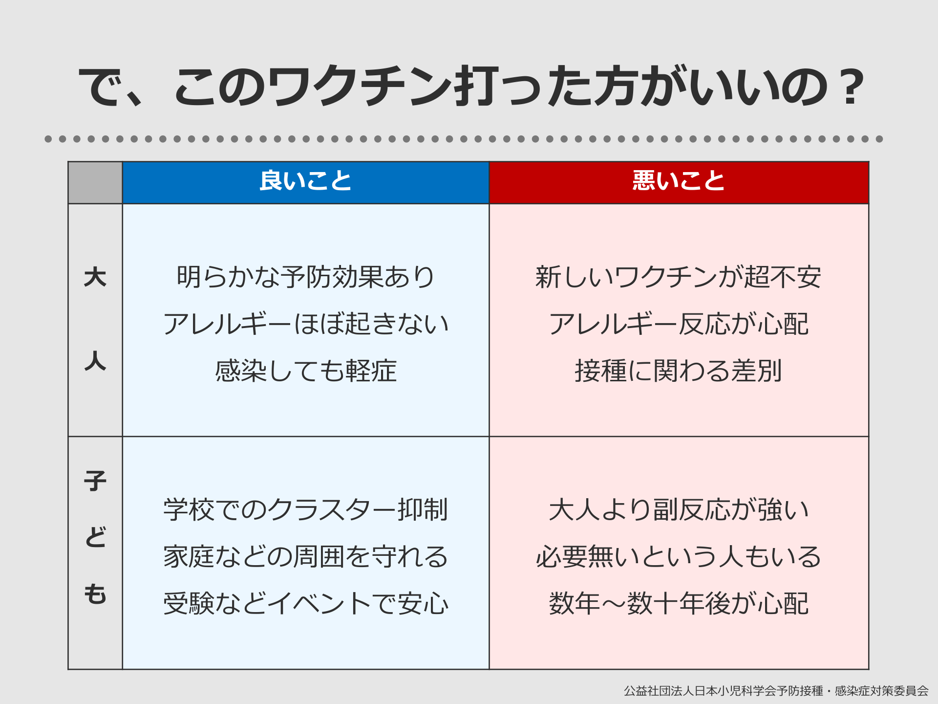 #117. で、このワクチン打った方がいいの? 大 人 子 ど も 良いこと 悪いこと 明らかな予防効果あり 新しいワクチンが超不安 アレルギーほぼ起きない アレルギー反応が心配 感染しても軽症 接種に関わる差別 学校でのクラスター抑制 大人より副反応が強い 家庭などの周囲を守れる 必要無いという人もいる 受験などイベントで安心 数年〜数十年後が心配 公益社団法人日本小児科学会予防接種・感染症対策委員会
