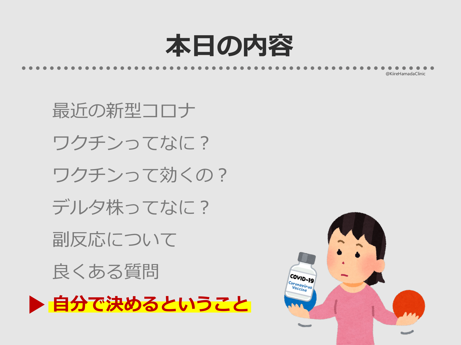 #122. 本日の内容 @KiireHamadaClinic 最近の新型コロナ ワクチンってなに? ワクチンって効くの? デルタ株ってなに? 副反応について 良くある質問 自分で決めるということ 接種する・しないの後悔を少なくするには、自分で決めることが大事です