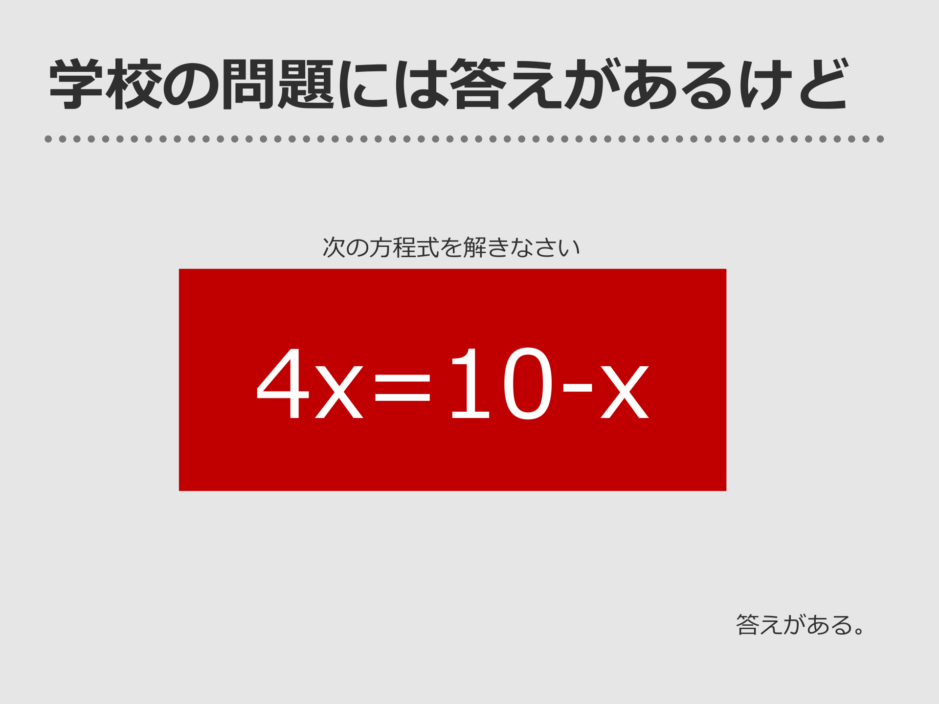 #115. 学校の問題には答えがあるけど 次の方程式を解きなさい 4x=10-x 答えがある。