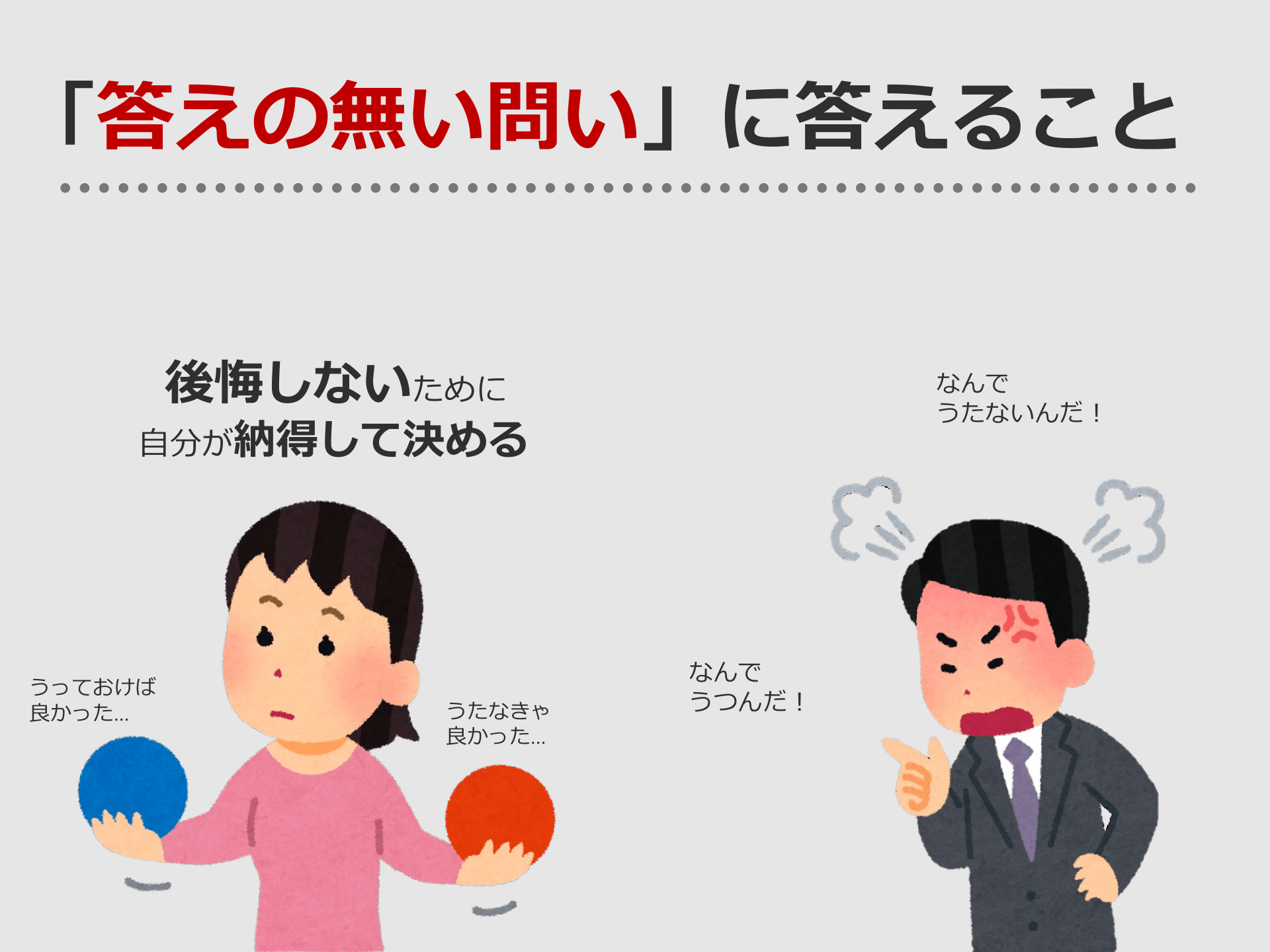 #116. 「答えの無い問い」に答えること 後悔しないために なんで うたないんだ! 自分が納得して決める うっておけば 良かった… うたなきゃ 良かった… なんで うつんだ!