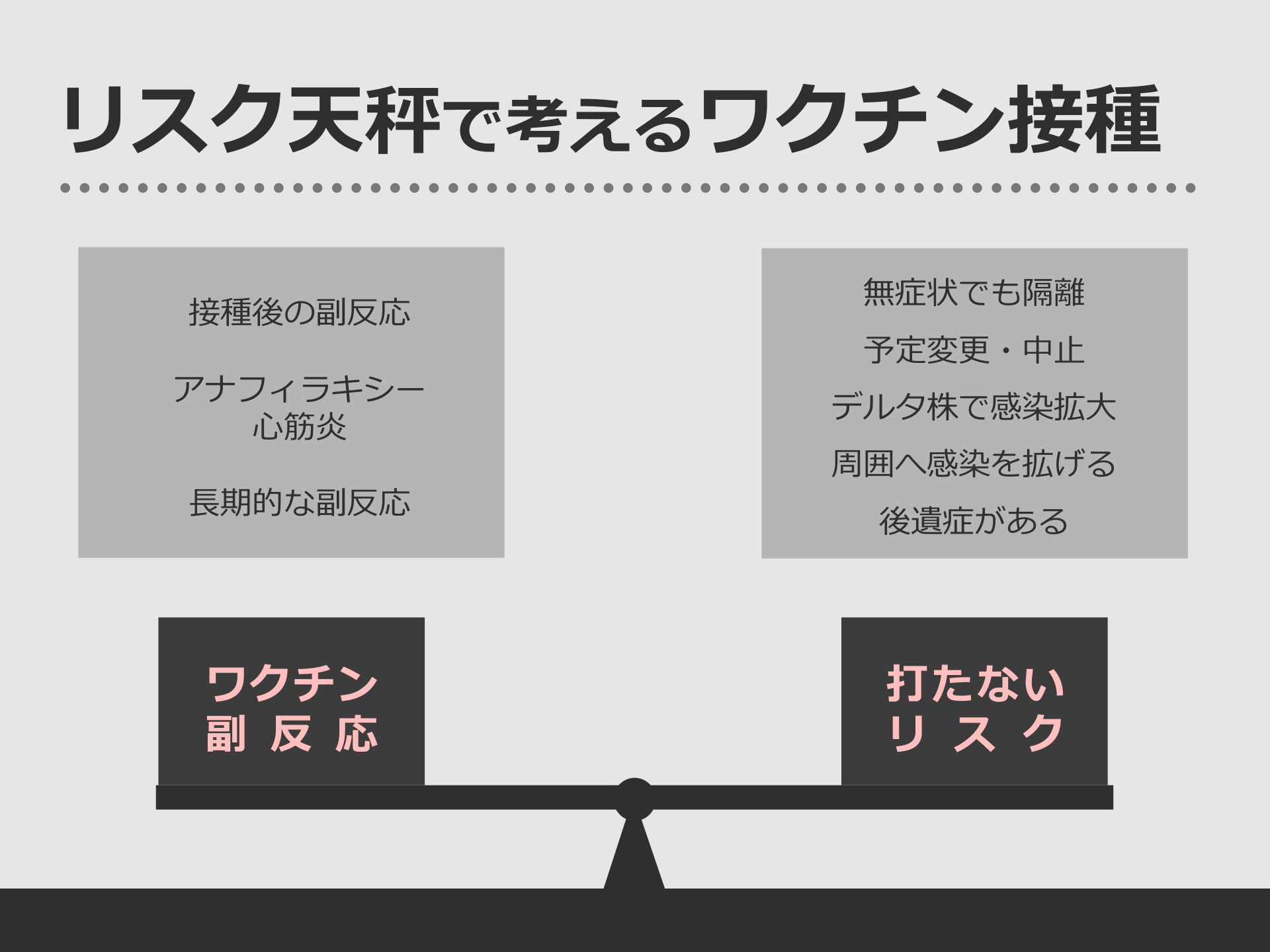 #118. リスク天秤で考えるワクチン接種 接種後の副反応 アナフィラキシー 心筋炎 長期的な副反応 ワクチン 副 反 応 無症状でも隔離 予定変更・中止 デルタ株で感染拡大 周囲へ感染を拡げる 後遺症がある 打たない リ ス ク