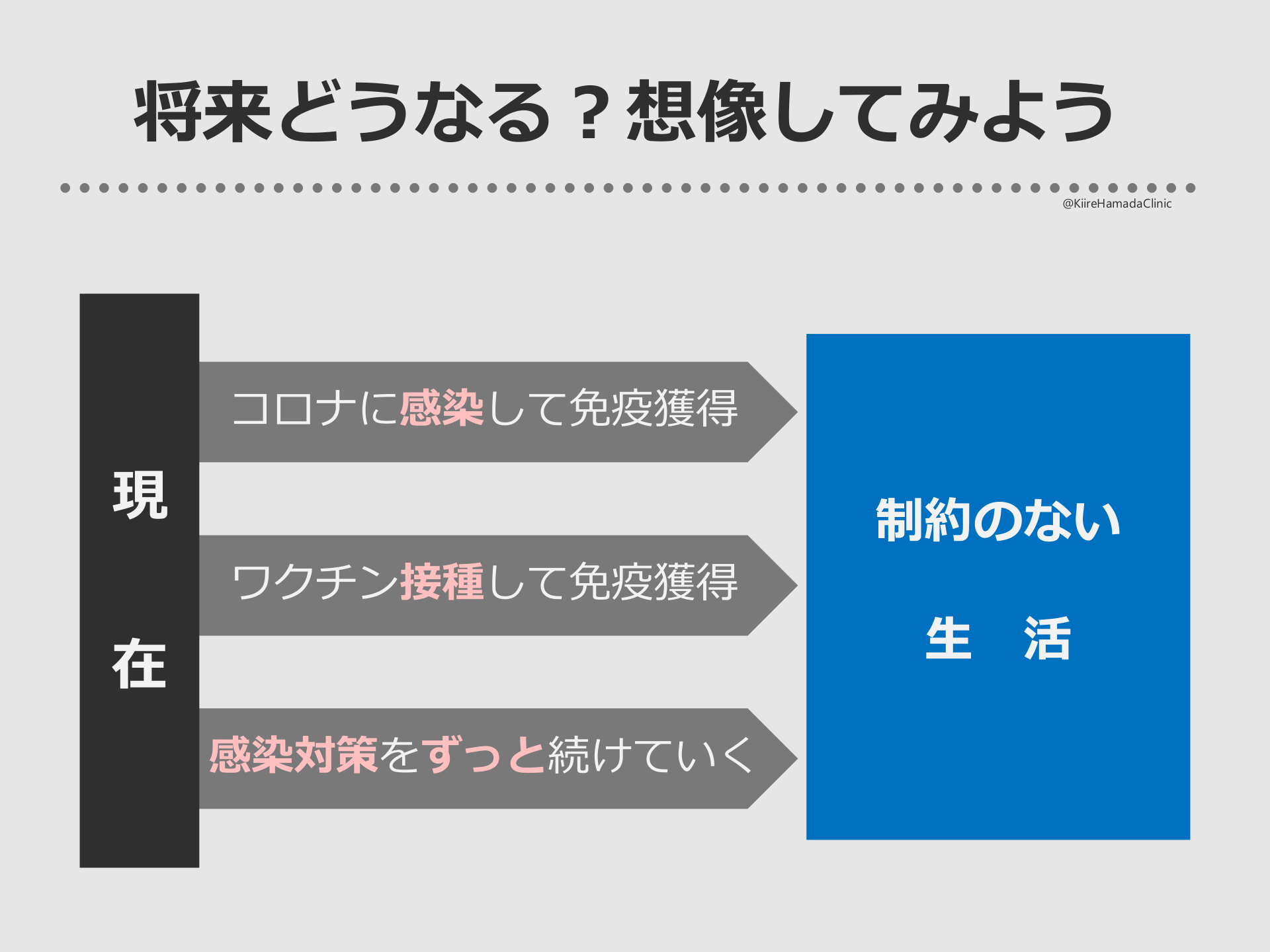 #120. 将来どうなる?想像してみよう @KiireHamadaClinic 現 コロナに感染して免疫獲得 在 ワクチン接種して免疫獲得 感染対策をずっと続けていく 制約のない 生 活
