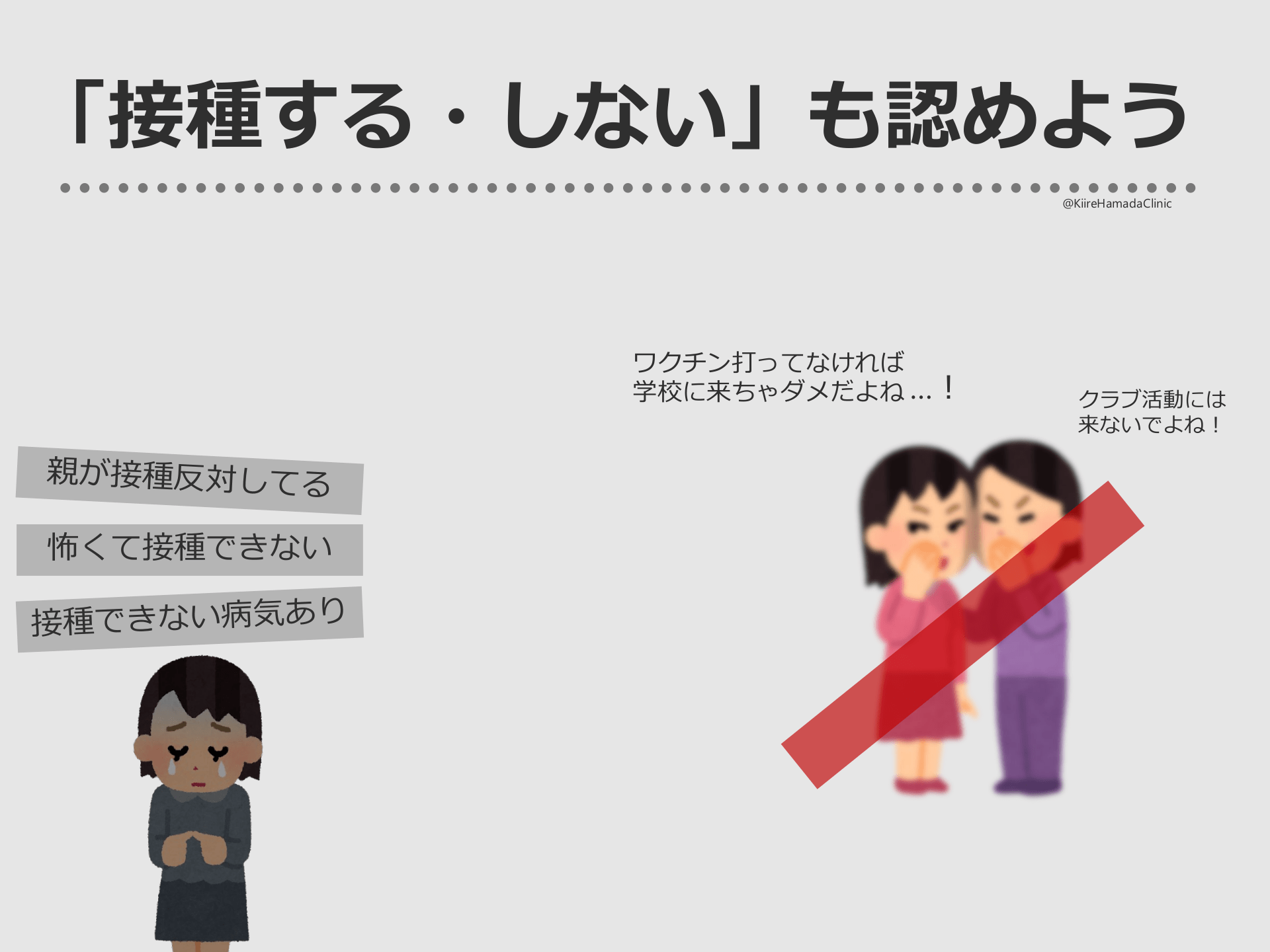 #121. 「接種する・しない」も認めよう @KiireHamadaClinic ワクチン打ってなければ 学校に来ちゃダメだよね …! 怖くて接種できない クラブ活動には 来ないでよね!