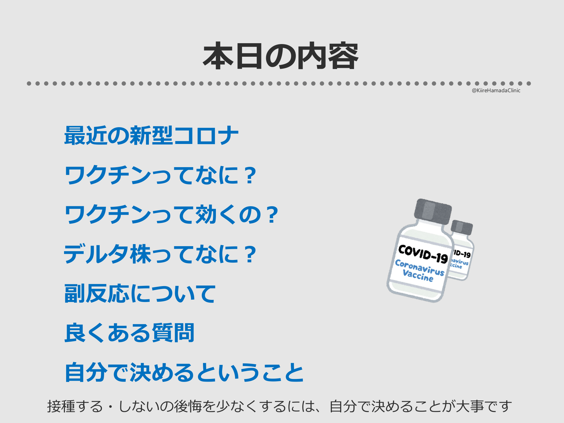 #64. 本日の内容 @KiireHamadaClinic 最近の新型コロナ ワクチンってなに? ワクチンって効くの? デルタ株ってなに? 副反応について 良くある質問 自分で決めるということ
