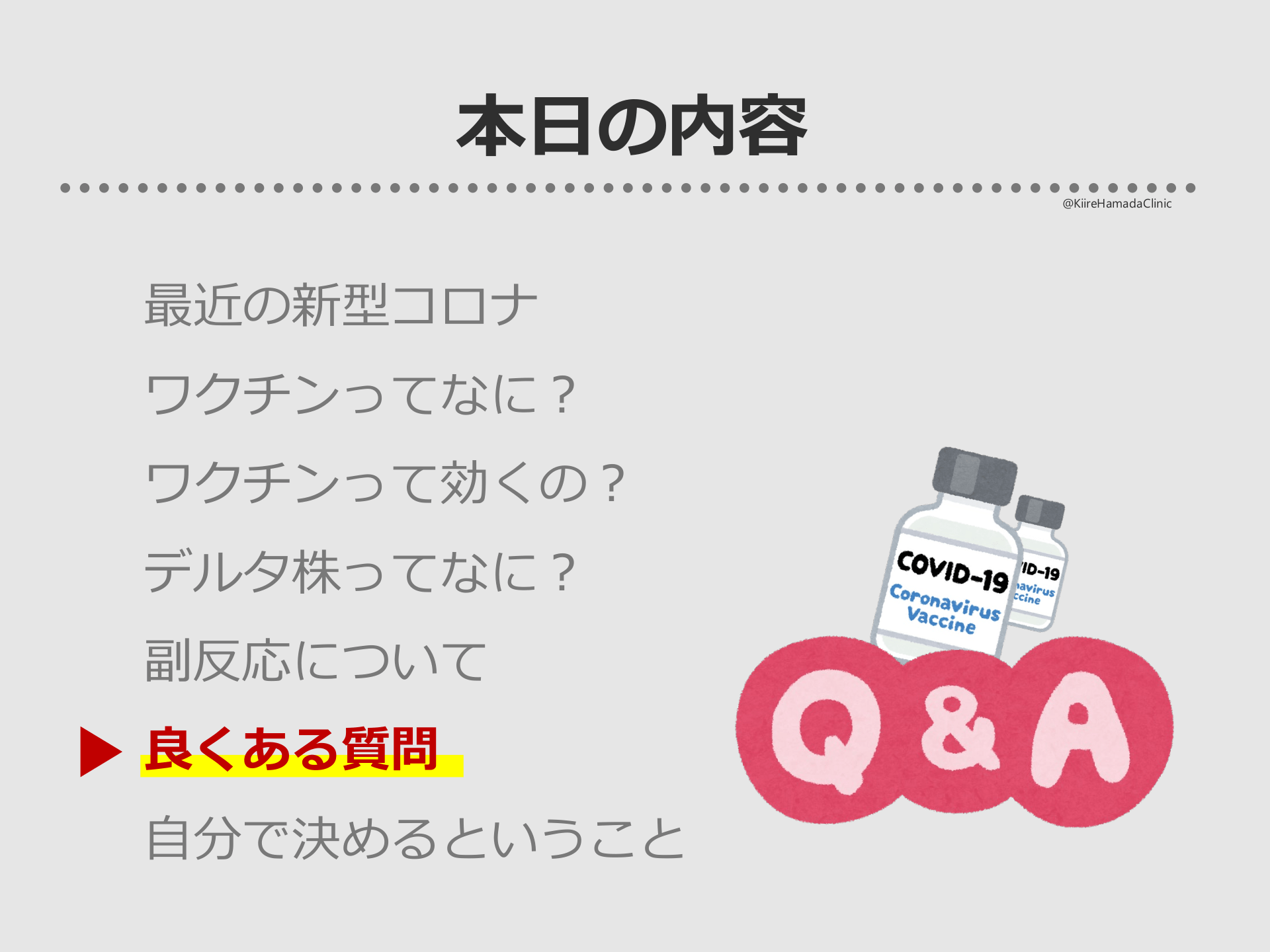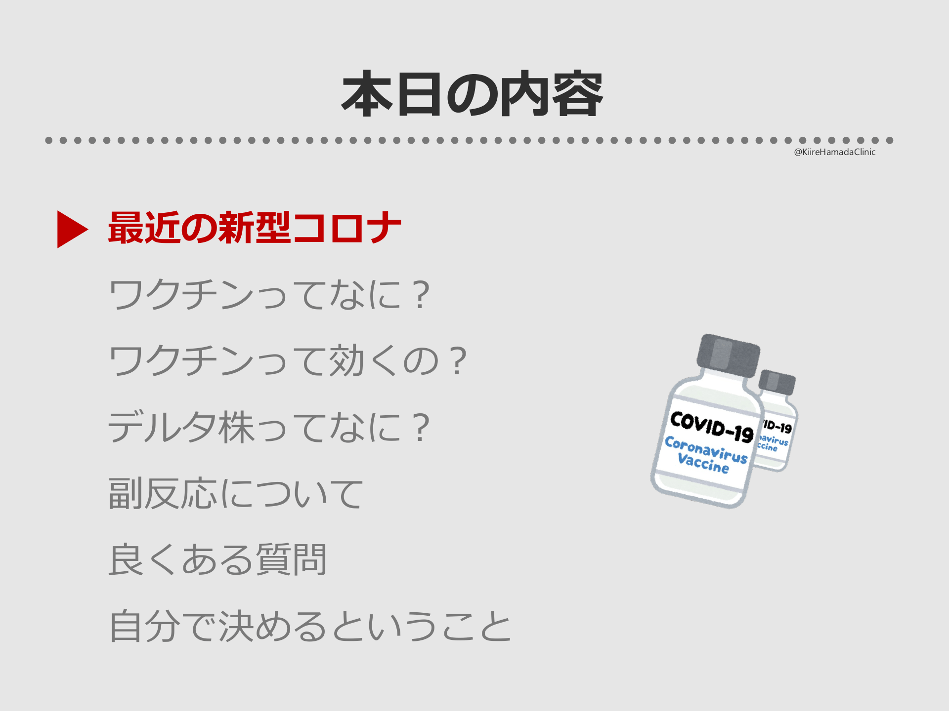 #58. 本日の内容 @KiireHamadaClinic 最近の新型コロナ ワクチンってなに? ワクチンって効くの? デルタ株ってなに? 副反応について 良くある質問 自分で決めるということ