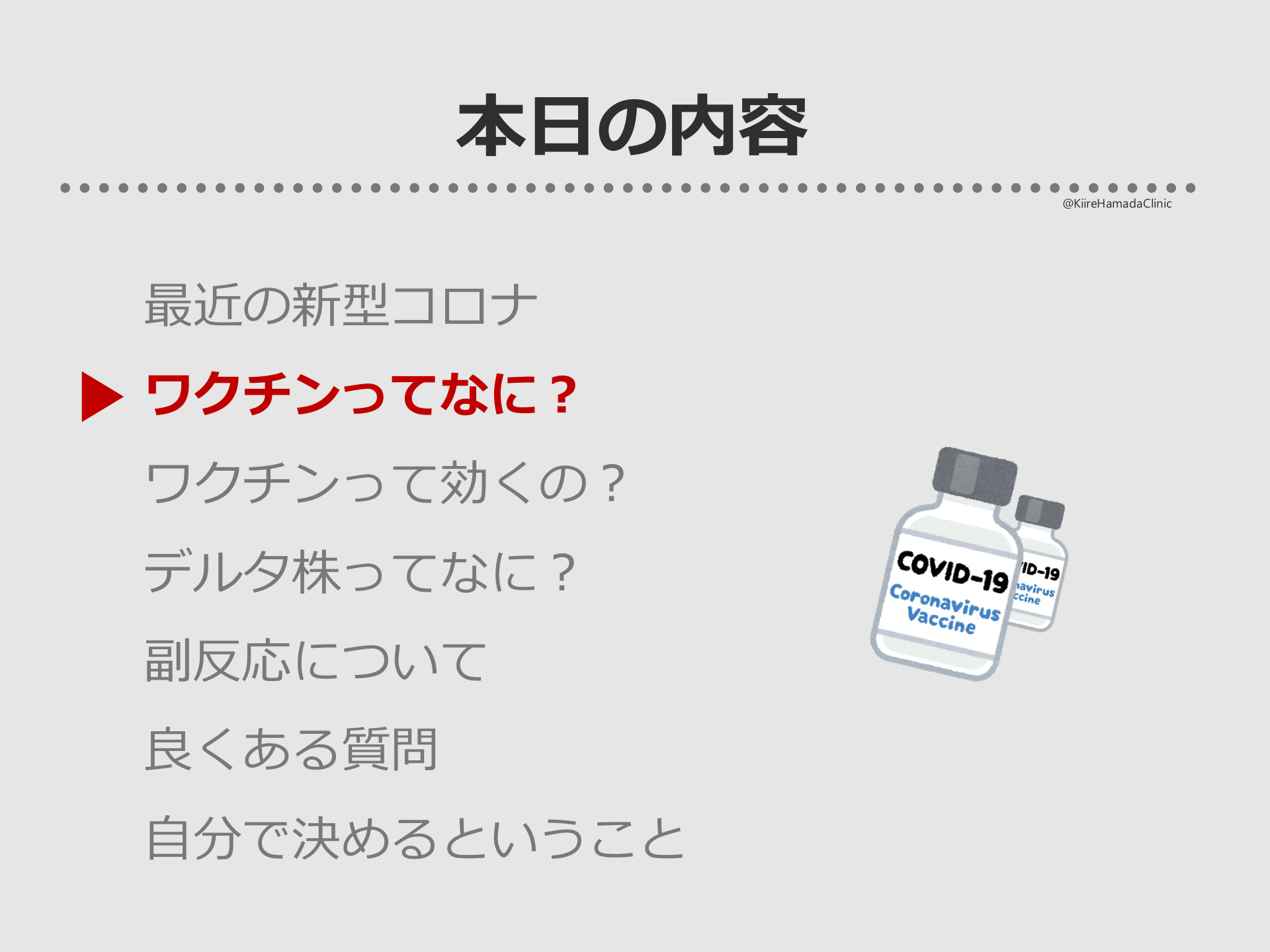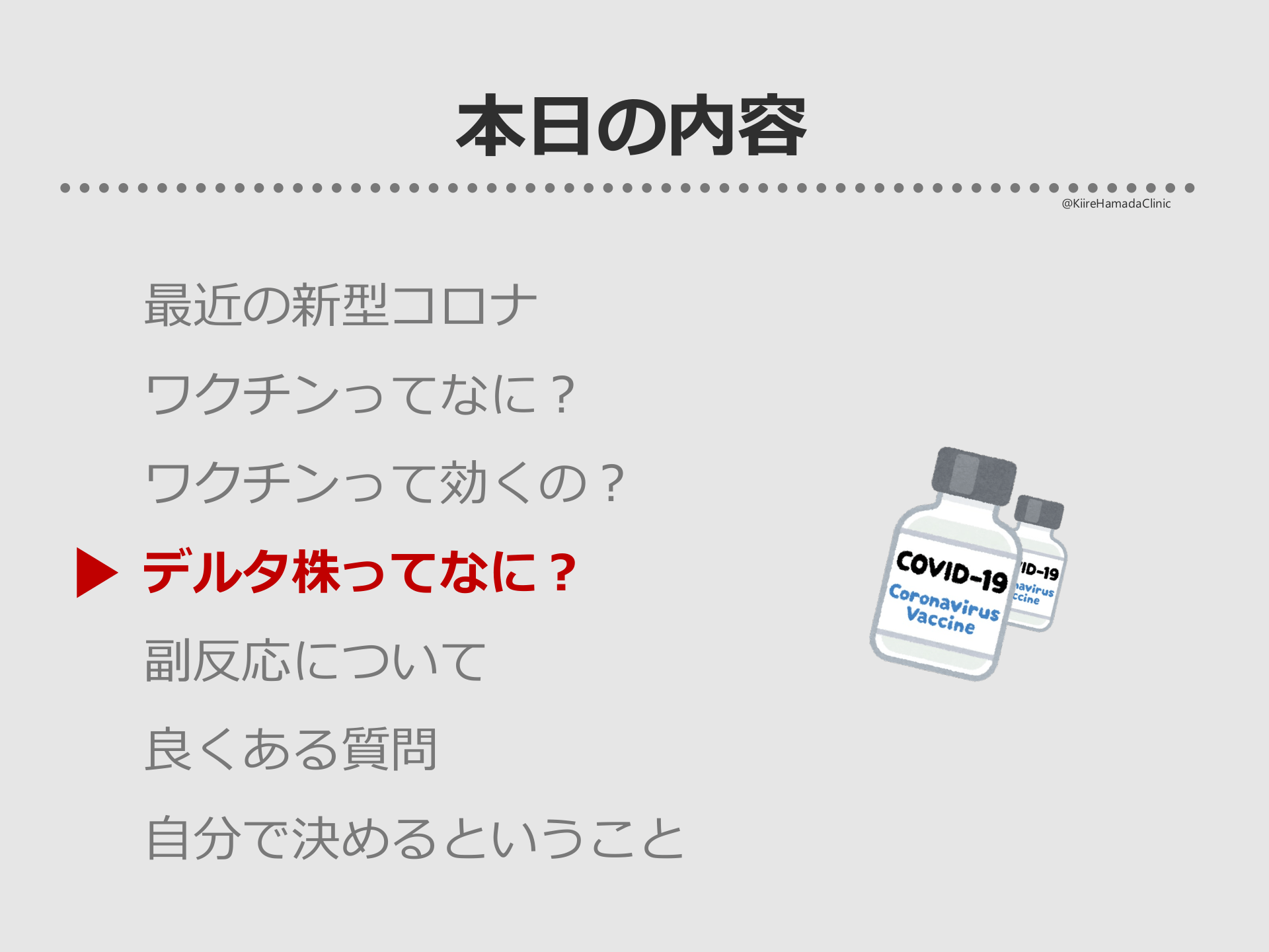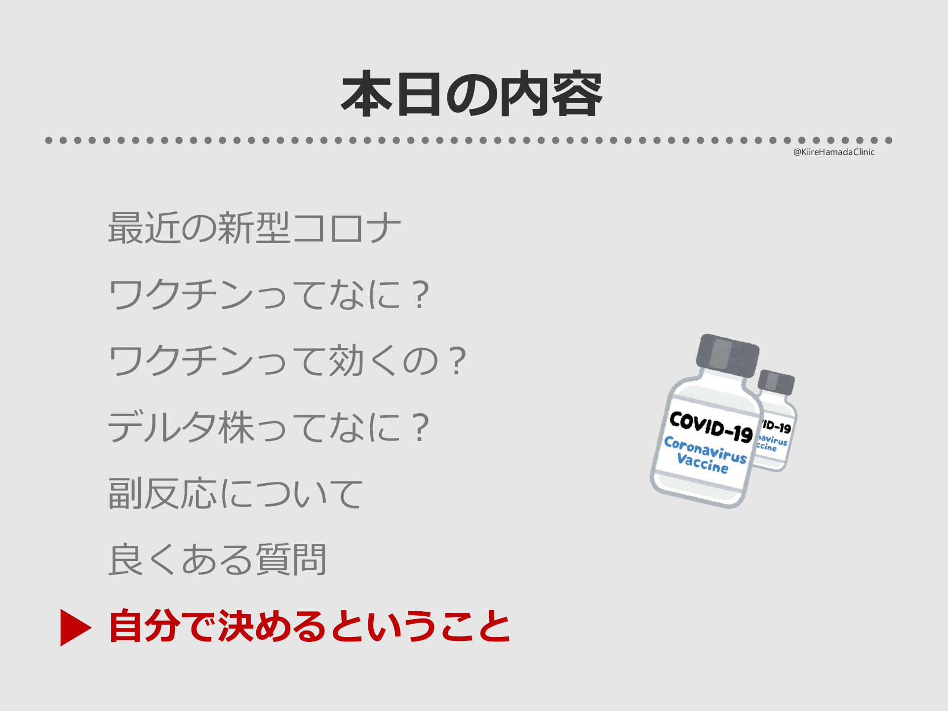 #19. 本日の内容 @KiireHamadaClinic 最近の新型コロナ ワクチンってなに? ワクチンって効くの? デルタ株ってなに? 副反応について 良くある質問 自分で決めるということ
