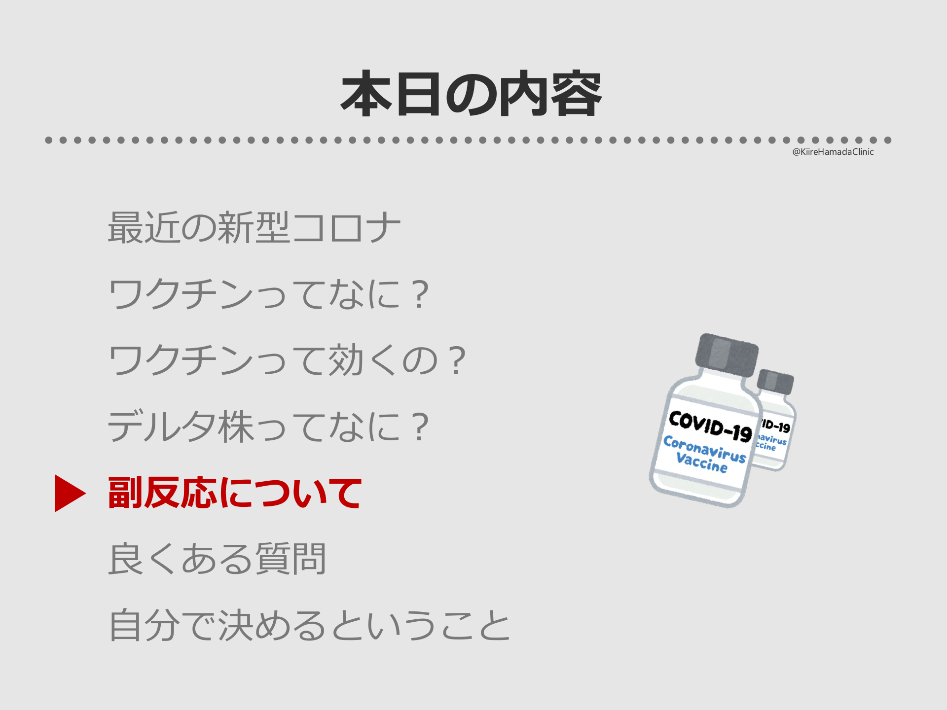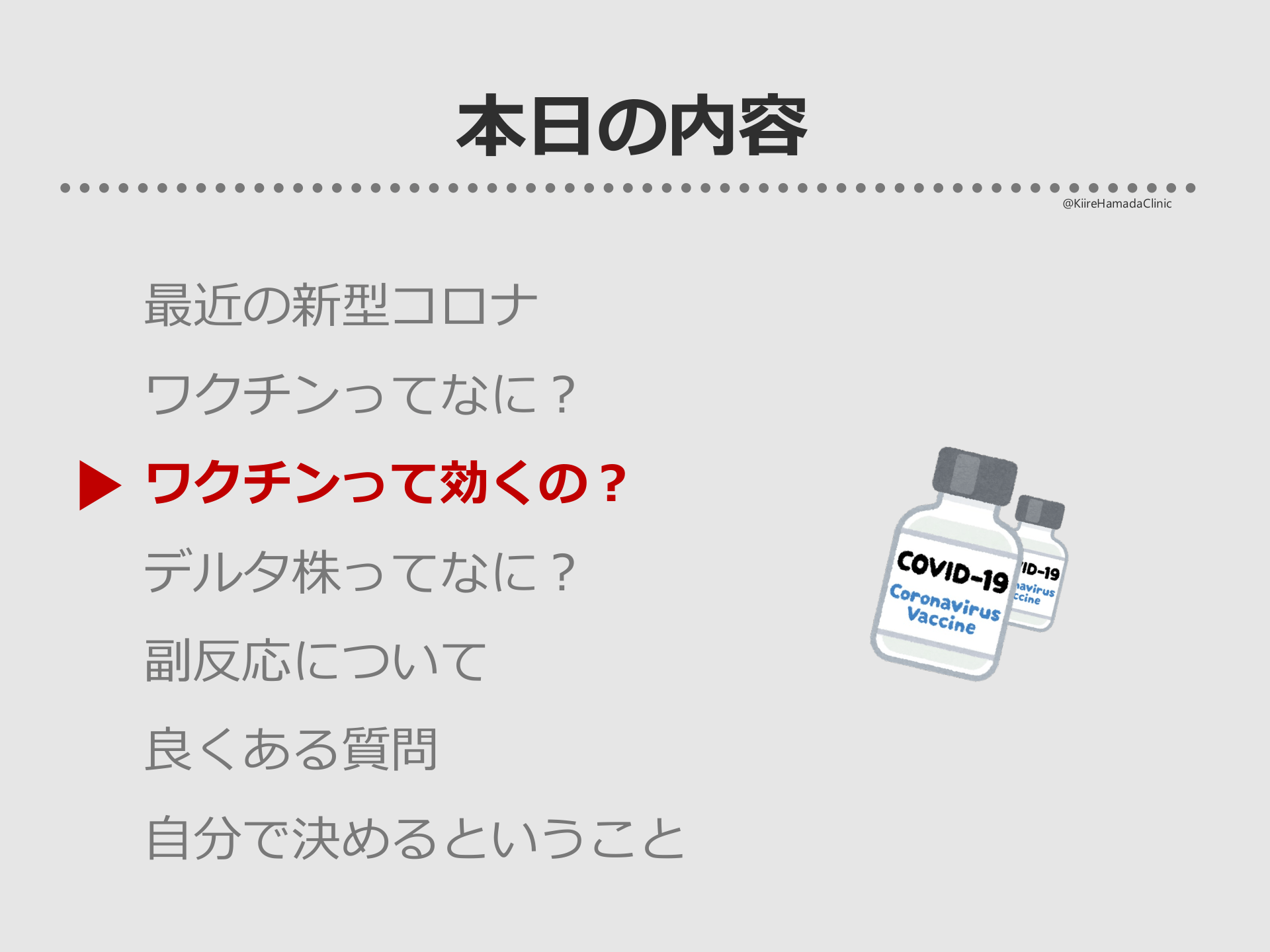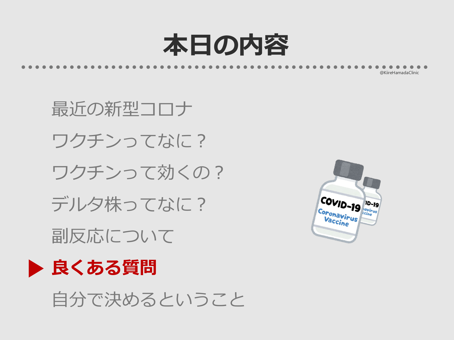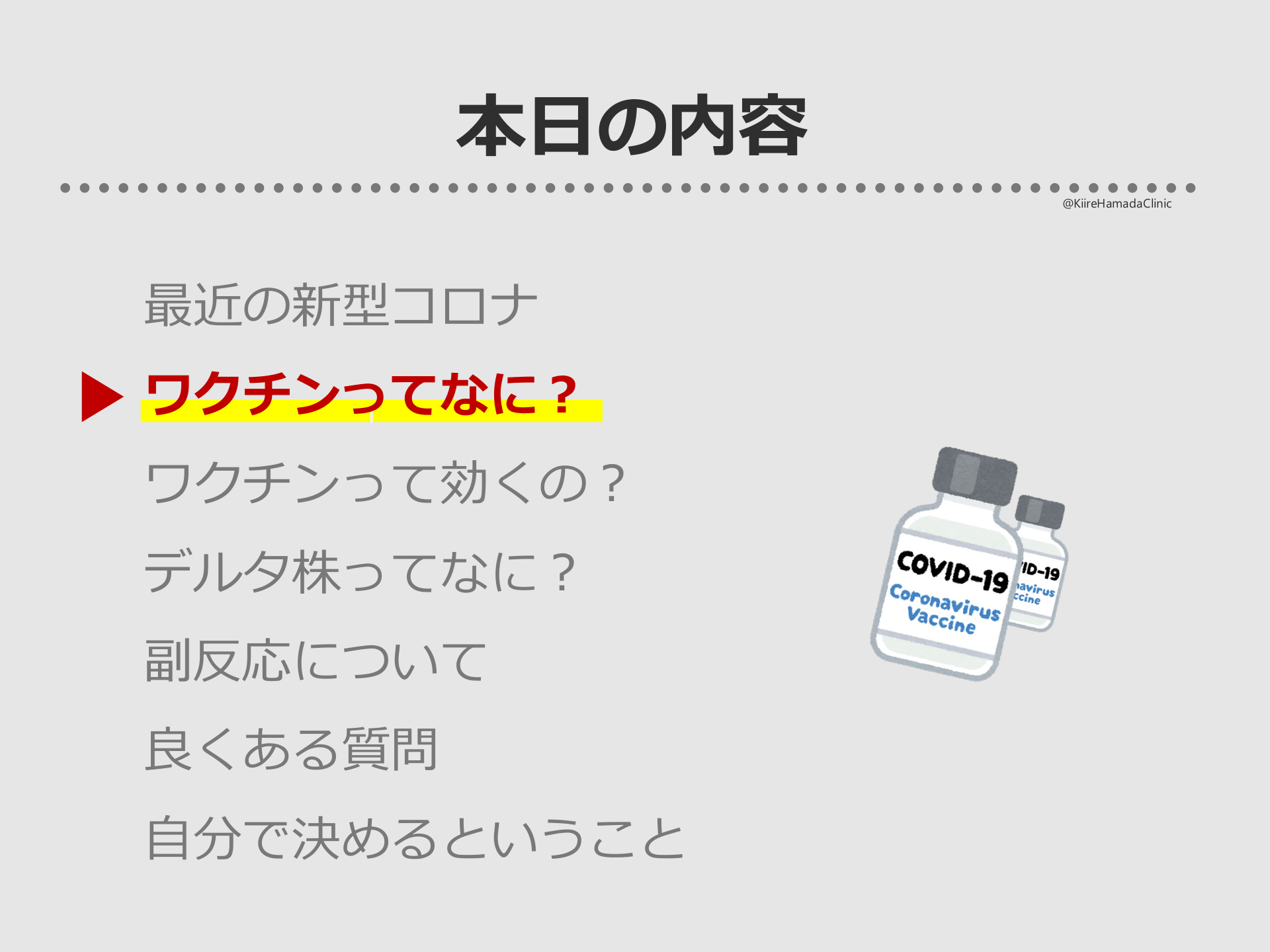 #19. 本日の内容 @KiireHamadaClinic 最近の新型コロナ ワクチンってなに? ワクチンって効くの? デルタ株ってなに? 副反応について 良くある質問 自分で決めるということ