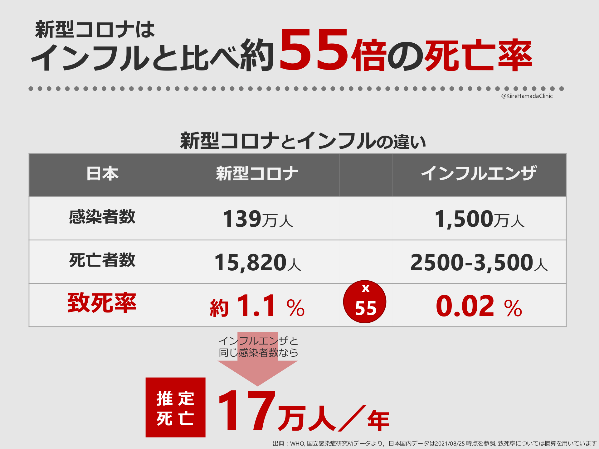 #21. 55倍の死亡率 新型コロナは インフルと比べ約 @KiireHamadaClinic 新型コロナとインフルの違い 日本 新型コロナ インフルエンザ 感染者数 139万人 1,500万人 死亡者数 15,820人 2500-3,500人 約 1.1 % 致死率 x 55 0.02 % インフルエンザと 同じ感染者数なら 推定 死亡 17万人/年 出典:WHO, 国立感染症研究所データより,日本国内データは2021/08/25 時点を参照. 致死率については概算を用いています