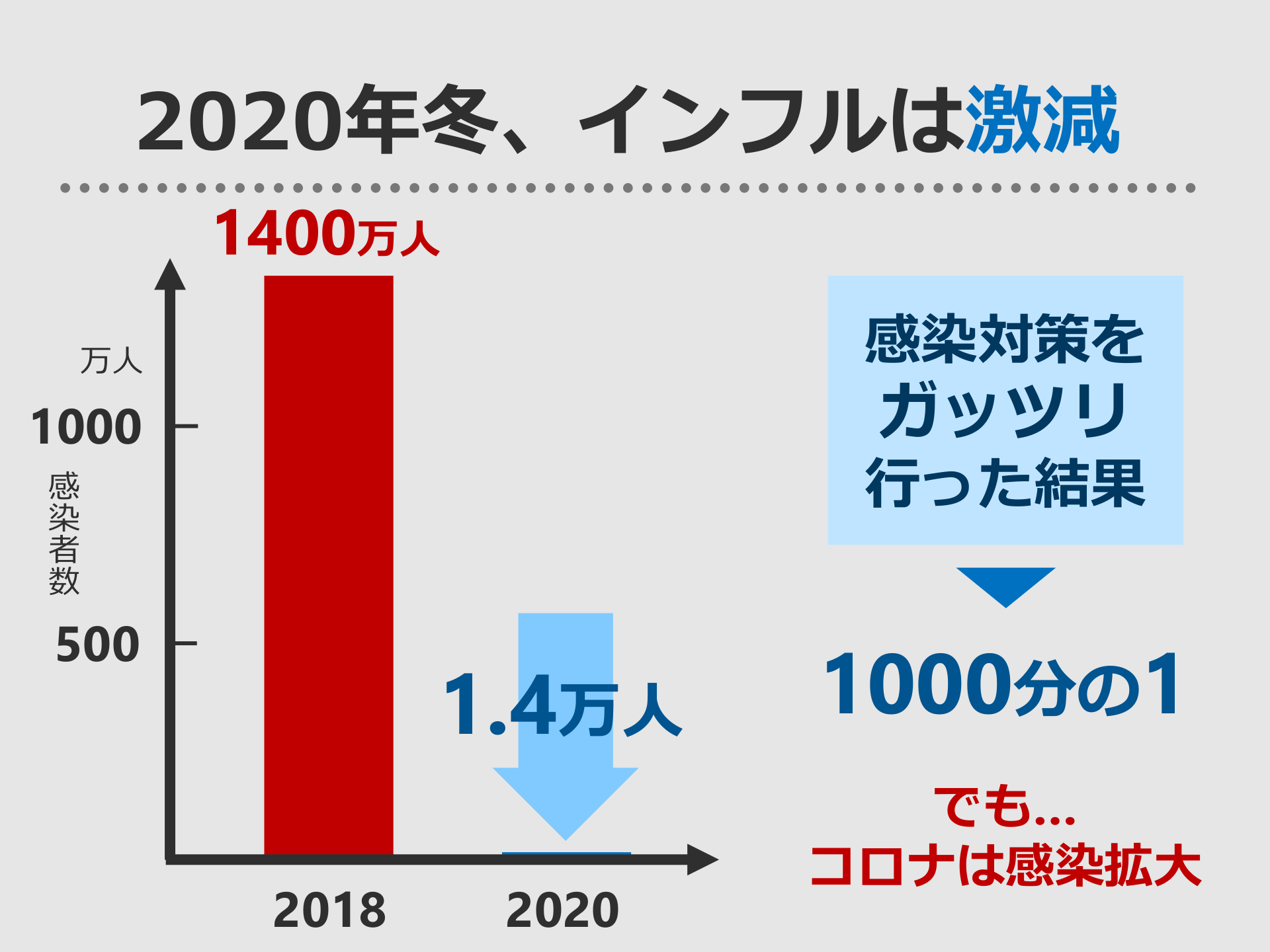 #22. 2020年冬、インフルは激減 1400万人 感染対策を 万人 ガッツリ 感染者数 1000 行った結果 500 1.4万人 2018 2020 1000分の1 でも… コロナは感染拡大