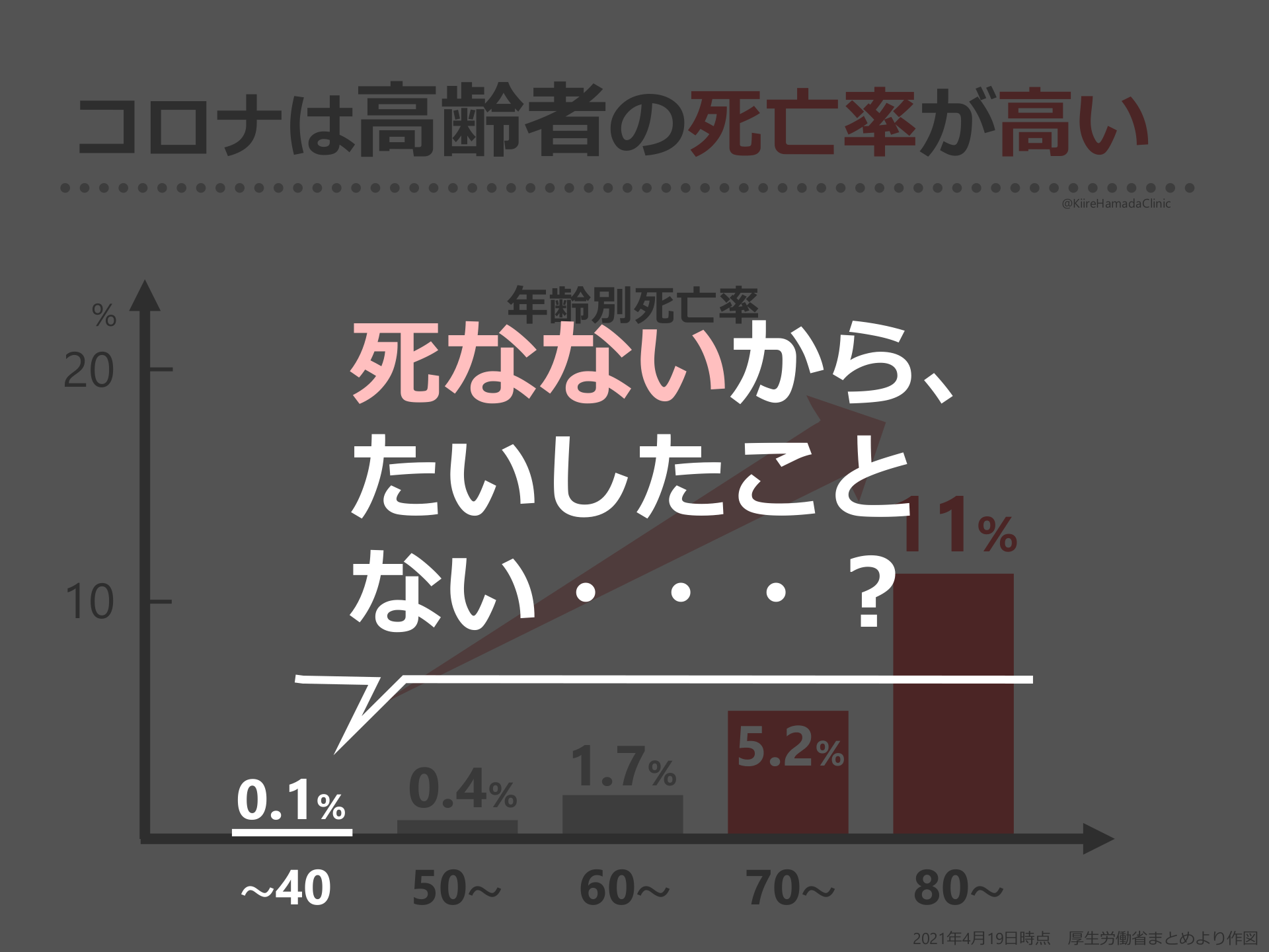 #24. コロナは高齢者の死亡率が高い @KiireHamadaClinic 年齢別死亡率 % 死なないから、 たいしたこと11% ない・・・? 20 10 0.1% 〜40 0.4% 1.7% 5.2% 50〜 60〜 70〜 80〜 2021年4月19日時点 厚生労働省まとめより作図