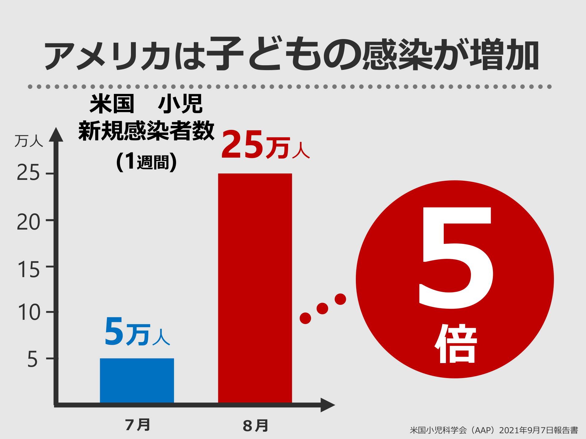 #29. アメリカは子どもの感染が増加 万人 25 米国 小児 新規感染者数 (1週間) 25万人 20 15 10 5 5万人 7月 5 倍 8月 米国小児科学会(AAP)2021年9月7日報告書