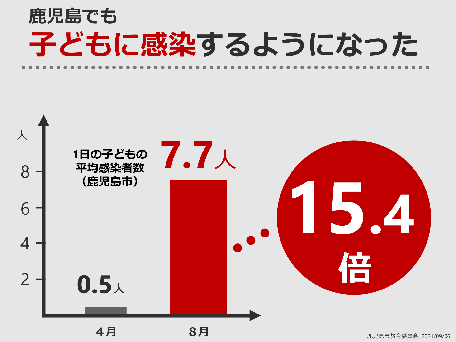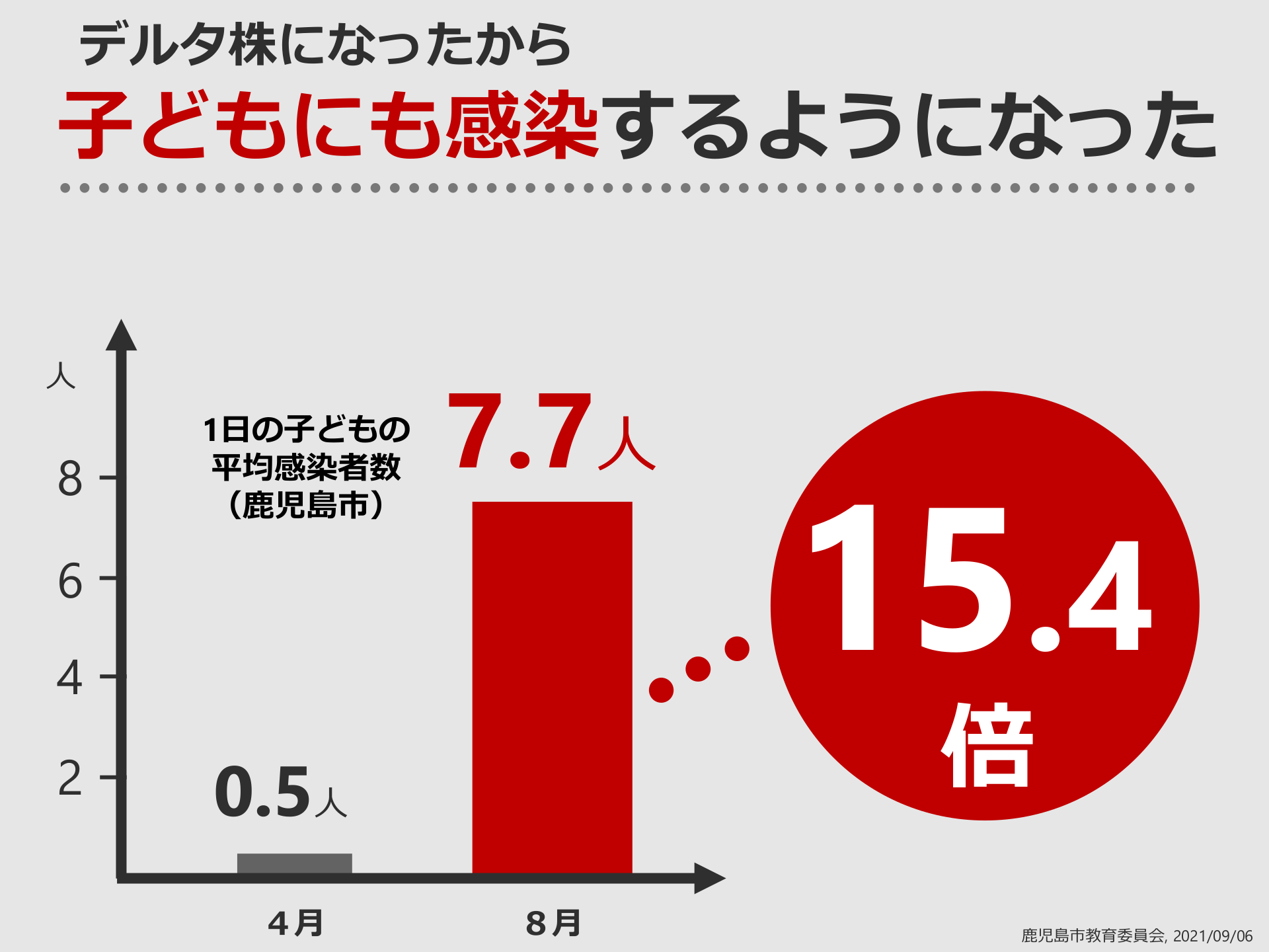 #71. デルタ株になったから 子どもにも感染するようになった 人 8 1日の子どもの 平均感染者数 (鹿児島市) 7.7人 6 4 2 倍 0.5人 4月 15.4 8月 鹿児島市教育委員会, 2021/09/06