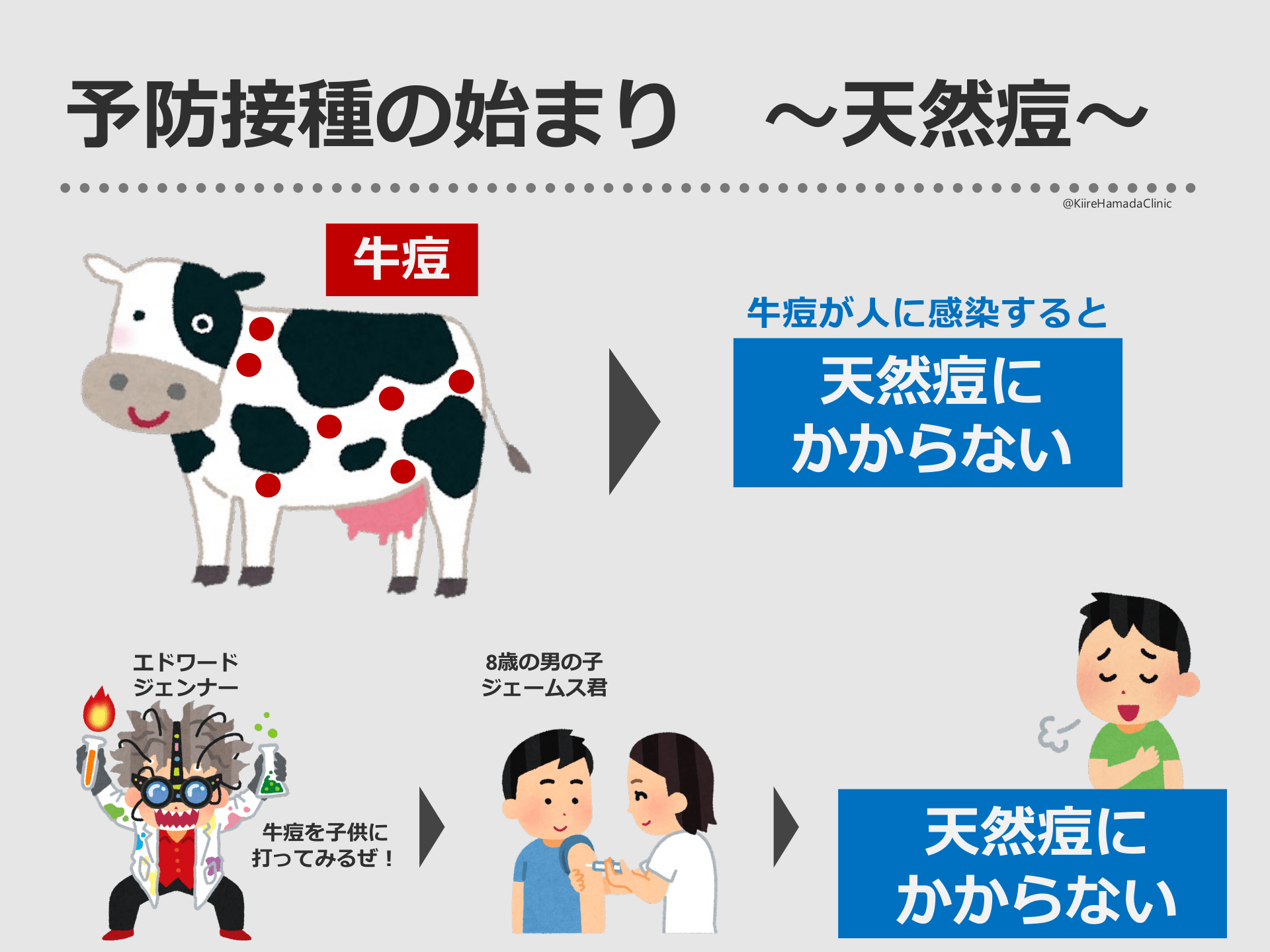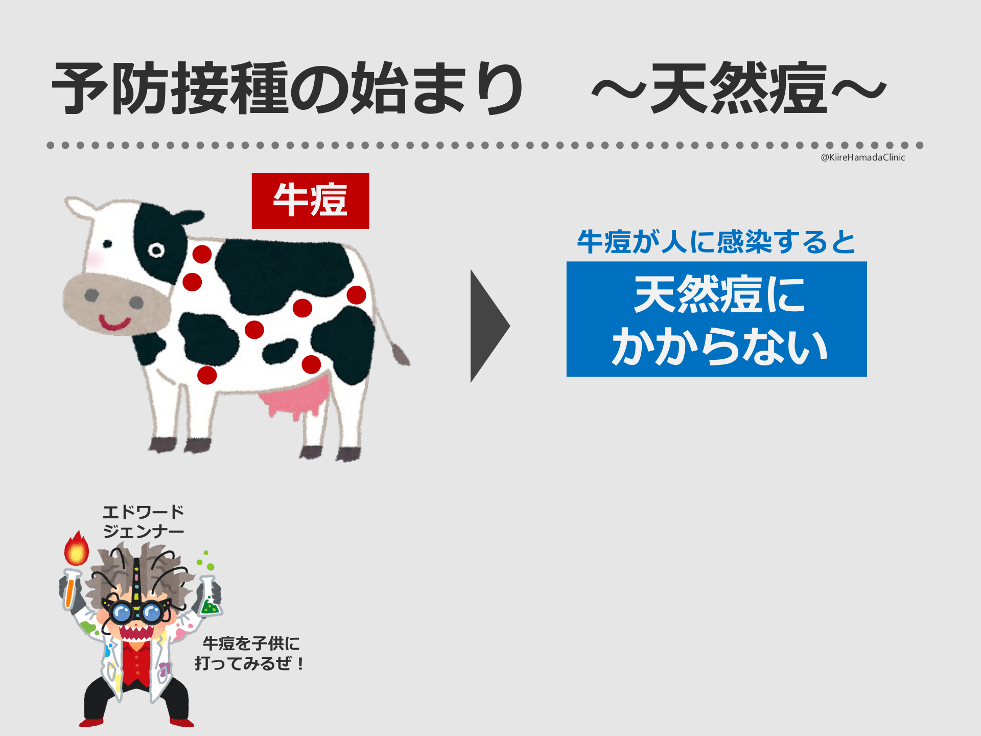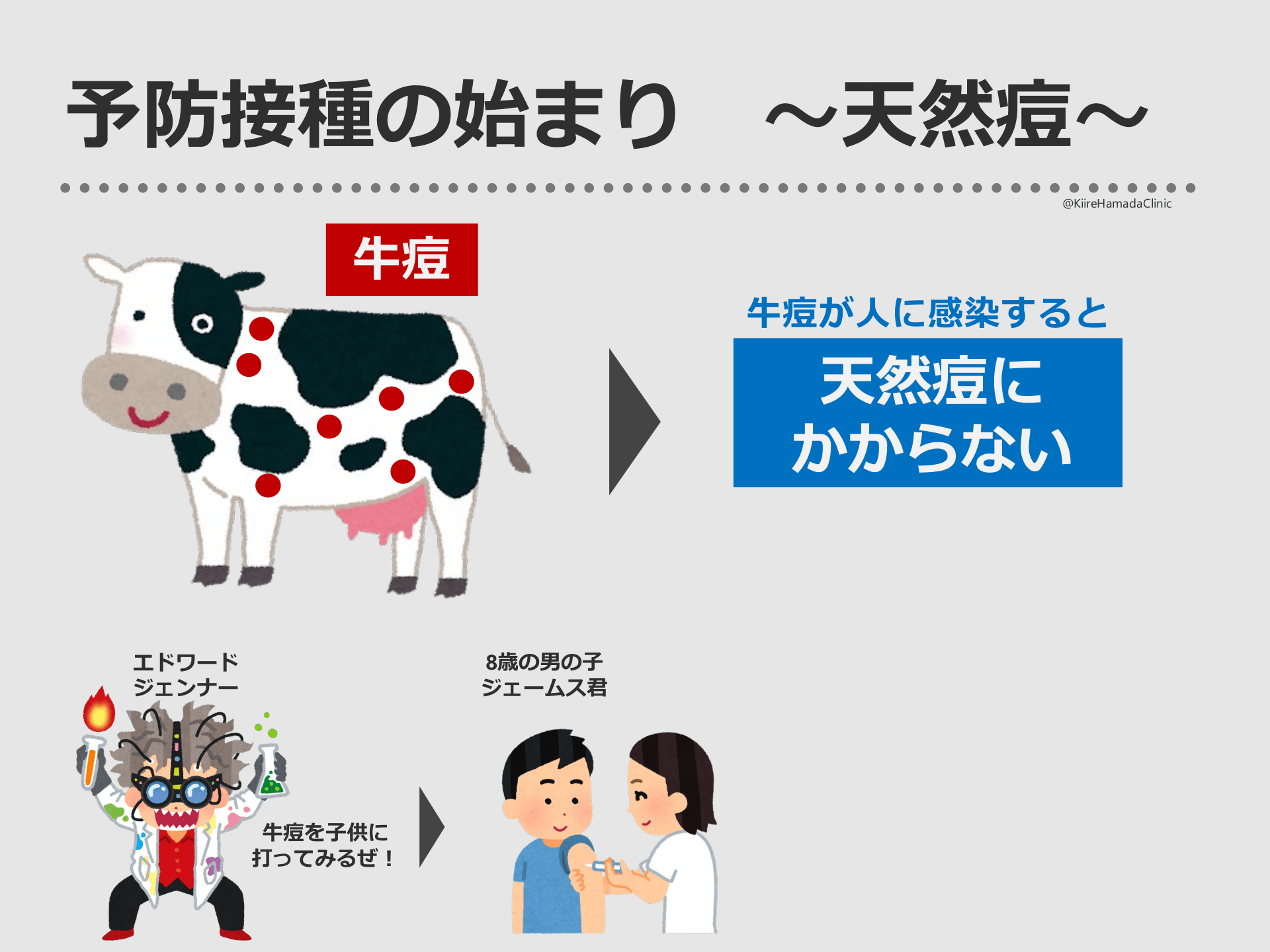 #37. 予防接種の始まり ~天然痘~ @KiireHamadaClinic 牛痘 牛痘が人に感染すると 天然痘に かからない エドワード ジェンナー 牛痘を子供に 打ってみるぜ!
