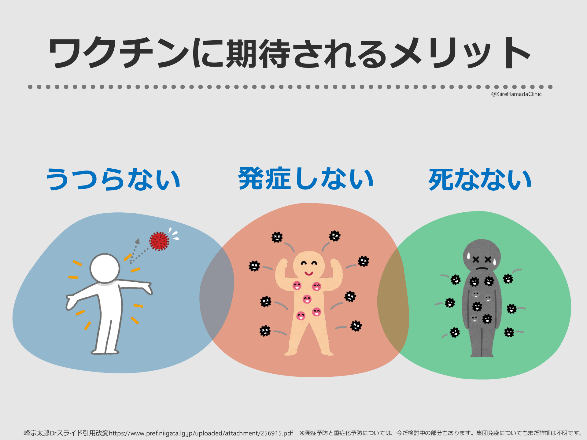 #48. ワクチンに期待されるメリット @KiireHamadaClinic うつらない 発症しない 死なない 峰宗太郎Drスライド引用改変https://www.pref.niigata.lg.jp/uploaded/attachment/256915.pdf ※発症予防と重症化予防については、今だ検討中の部分もあります。集団免疫についてもまだ詳細は不明です。