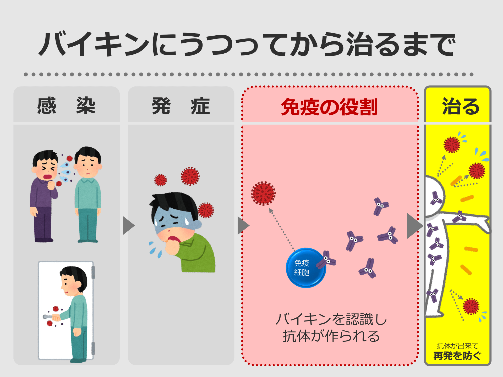 #49. バイキンにうつってから治るまで 感 染 発 症 免疫の役割 治る 免疫 細胞 バイキンを認識し 抗体が作られる 抗体が出来て 再発を防ぐ