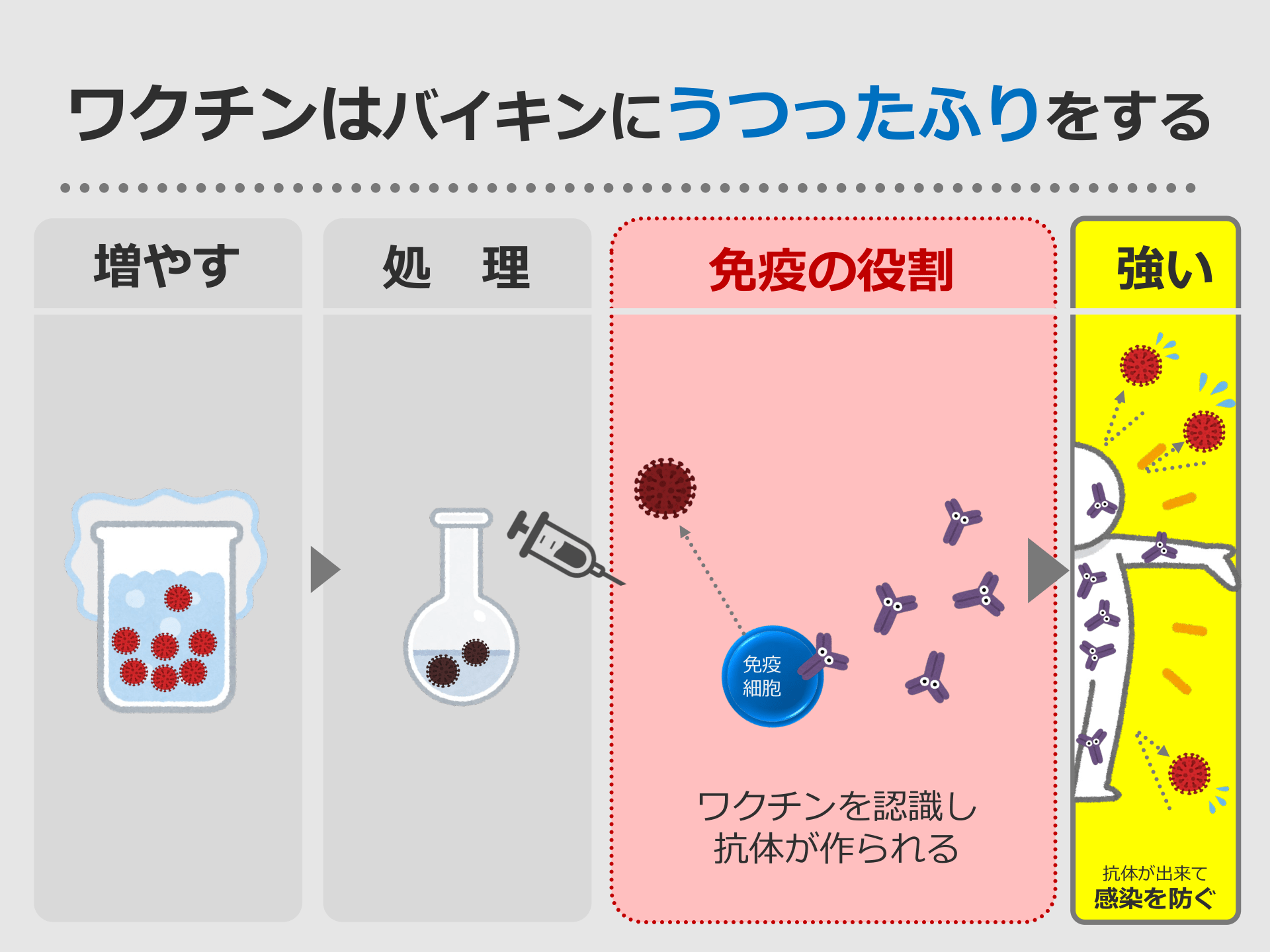 #50. ワクチンはバイキンにうつったふりをする 増やす 処 理 免疫の役割 強い 免疫 細胞 ワクチンを認識し 抗体が作られる 抗体が出来て 感染を防ぐ