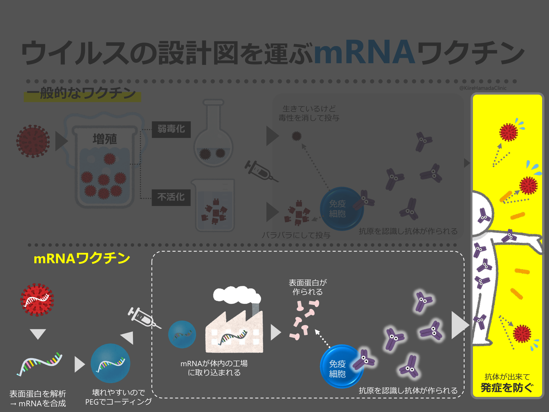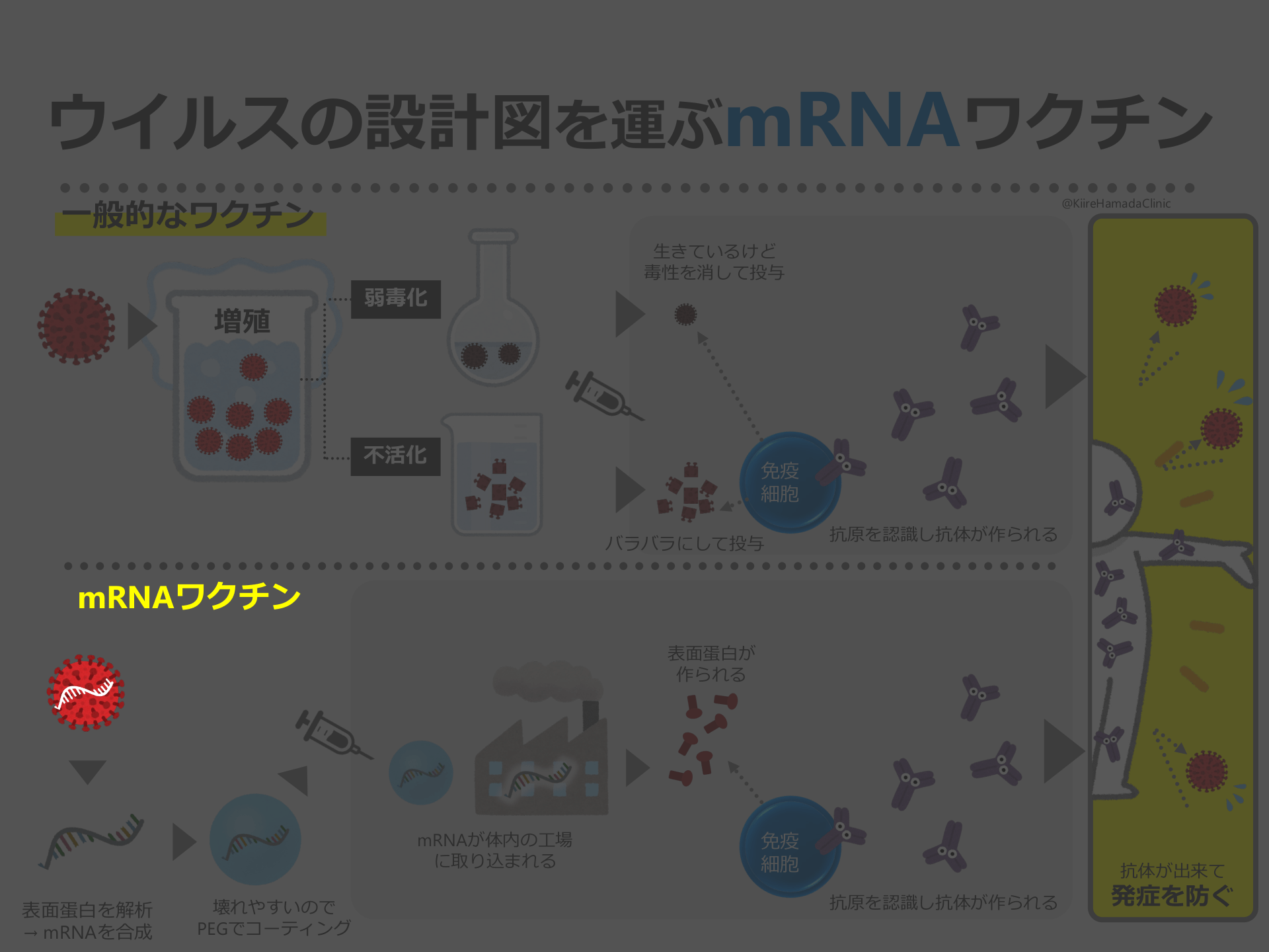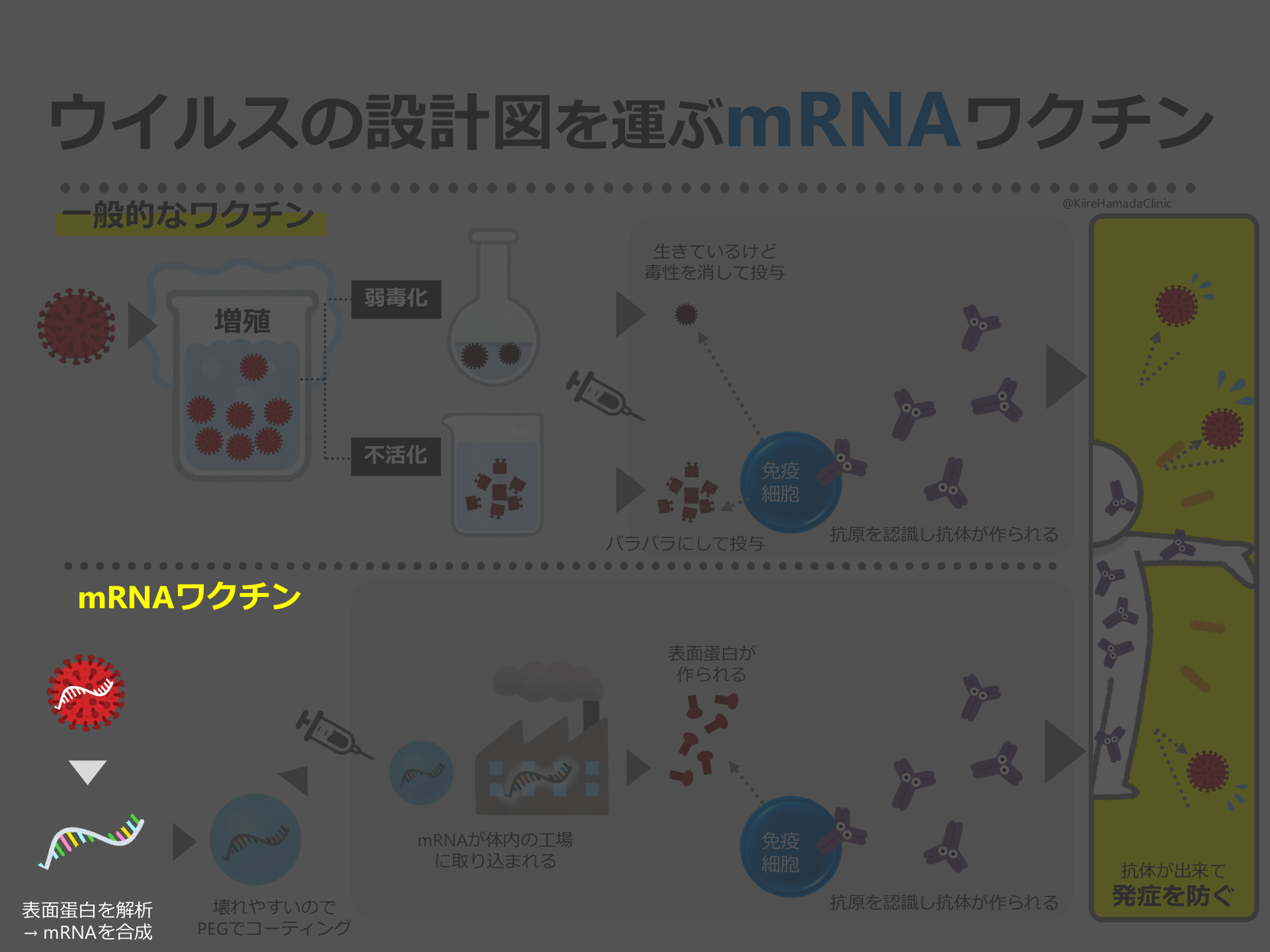 #56. ウイルスの設計図を運ぶmRNAワクチン @KiireHamadaClinic 一般的なワクチン 増殖 弱毒化 生きているけど 毒性を消して投与 不活化 免疫 細胞 バラバラにして投与 抗原を認識し抗体が作られる mRNAワクチン 表面蛋白が 作られる mRNAが体内の工場 に取り込まれる 表面蛋白を解析 → mRNAを合成 壊れやすいので PEGでコーティング 免疫 細胞 抗体が出来て 抗原を認識し抗体が作られる 発症を防ぐ