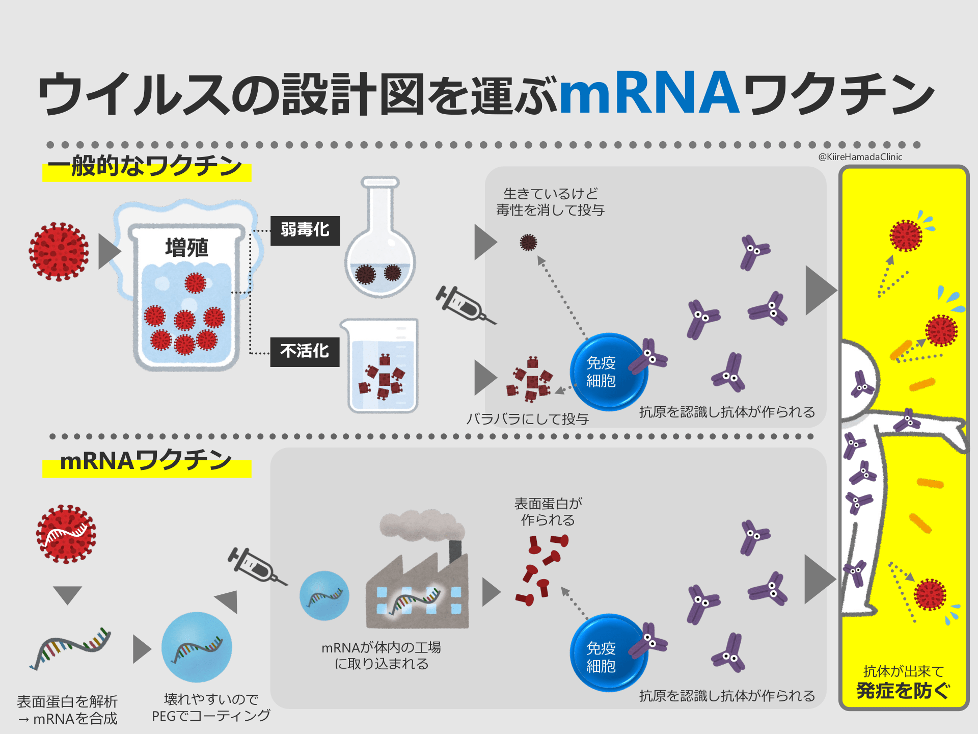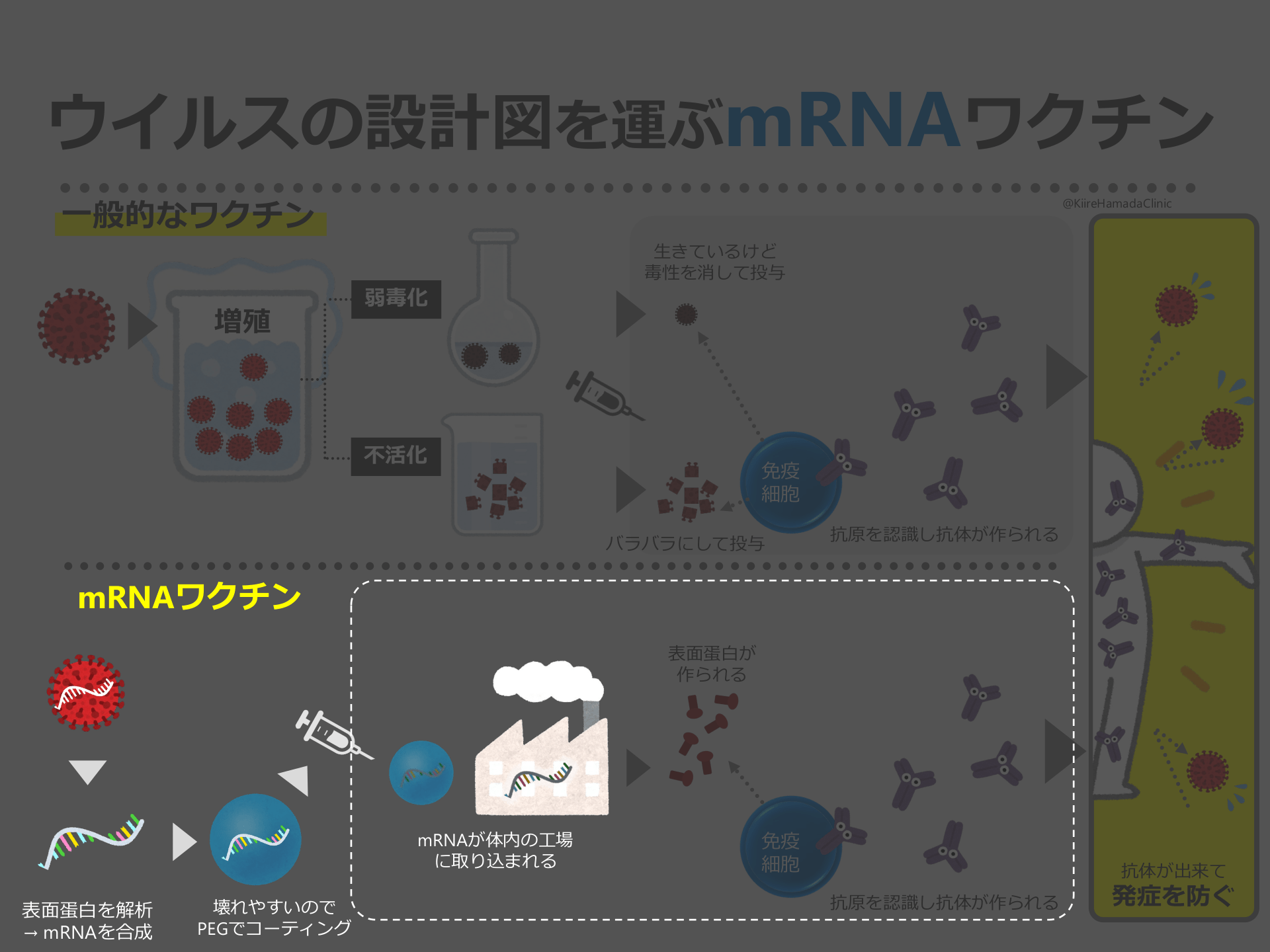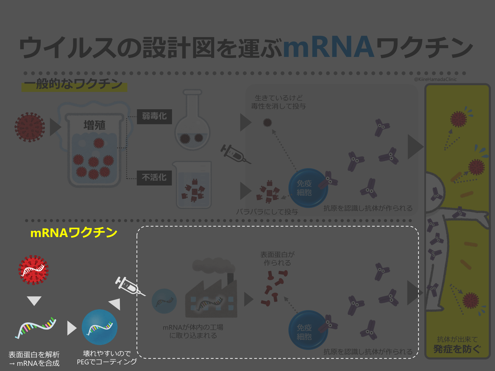 #56. ウイルスの設計図を運ぶmRNAワクチン @KiireHamadaClinic 一般的なワクチン 増殖 弱毒化 生きているけど 毒性を消して投与 不活化 免疫 細胞 バラバラにして投与 抗原を認識し抗体が作られる mRNAワクチン 表面蛋白が 作られる mRNAが体内の工場 に取り込まれる 表面蛋白を解析 → mRNAを合成 壊れやすいので PEGでコーティング 免疫 細胞 抗体が出来て 抗原を認識し抗体が作られる 発症を防ぐ
