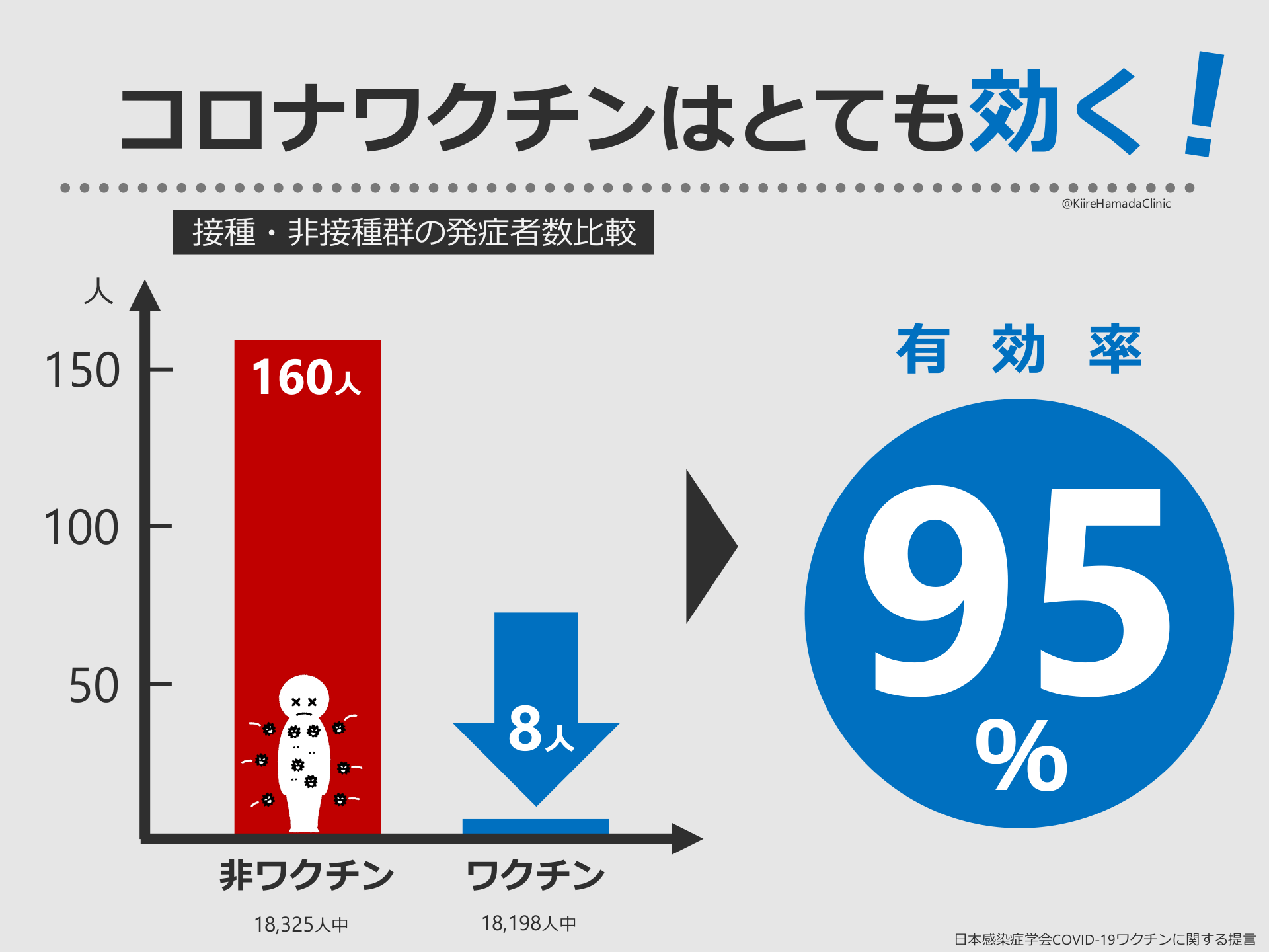 #59. コロナワクチンはとても効く 接種・非接種群の発症者数比較 人 150 有 効 率 160人 100 50 8人 非ワクチン 18,325人中 @KiireHamadaClinic 95 % ワクチン 18,198人中 日本感染症学会COVID-19ワクチンに関する提言