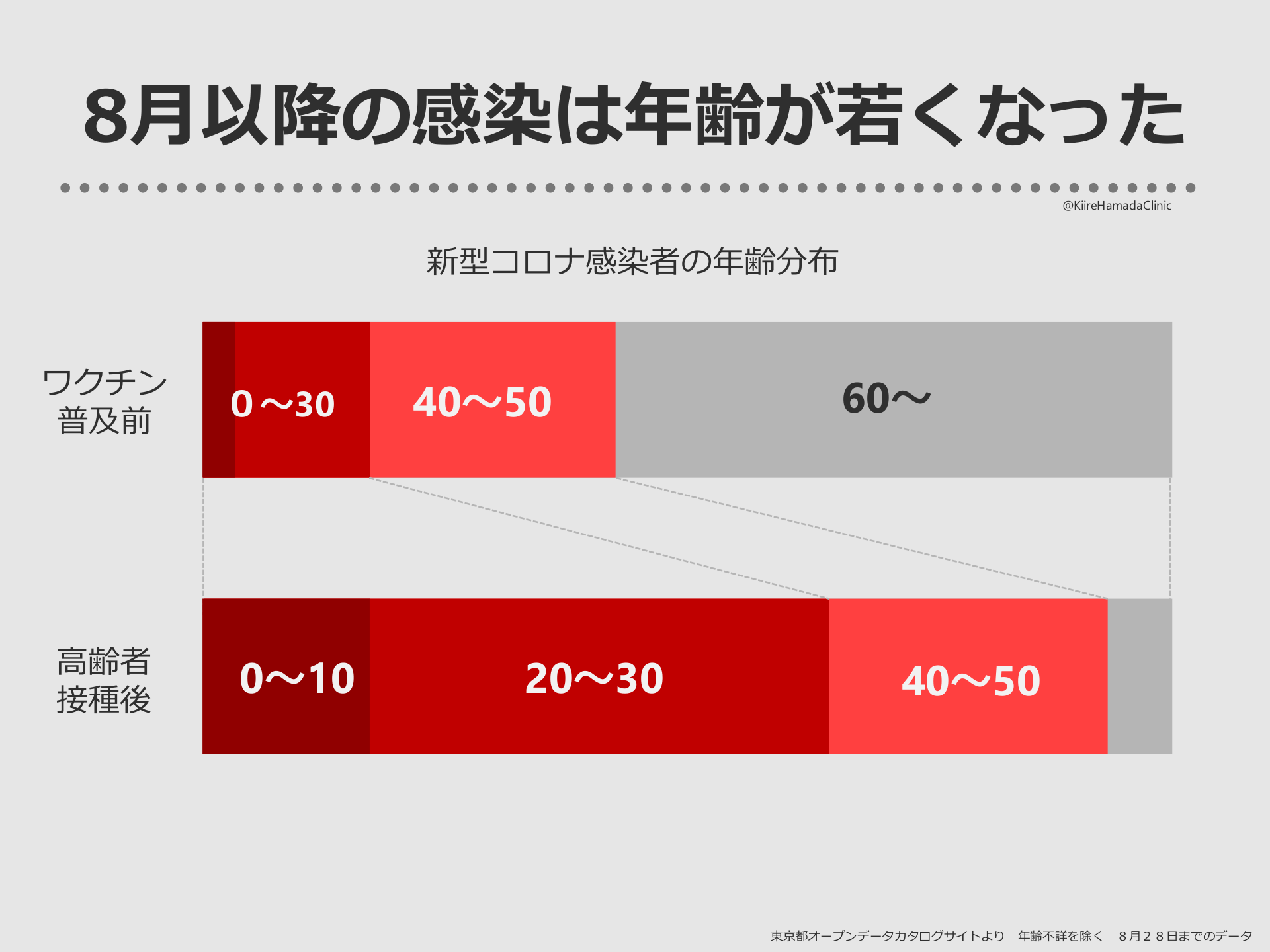 #60. 8月以降の感染は年齢が若くなった @KiireHamadaClinic 新型コロナ感染者の年齢分布 ワクチン 普及前 高齢者 接種後 0〜30 0〜10 40〜50 20〜30 60〜 40〜50 東京都オープンデータカタログサイトより 年齢不詳を除く 8月28日までのデータ