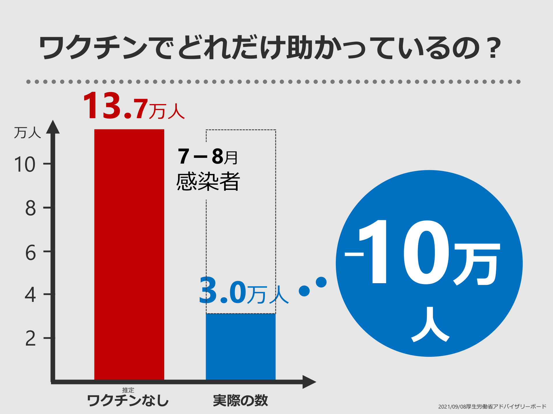 #62. ワクチンでどれだけ助かっているの? 万人 13.7万人 7-8月 感染者 10 8 6 3.0万人 4 2 推定 ワクチンなし 実際の数 10万 人 2021/09/08厚生労働省アドバイザリーボード