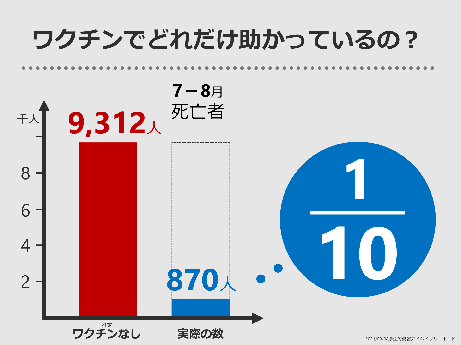 #63. ワクチンでどれだけ助かっているの? 千人 9,312人 7-8月 死亡者 1 8 6 4 870人 2 推定 ワクチンなし 実際の数 10 2021/09/08厚生労働省アドバイザリーボード