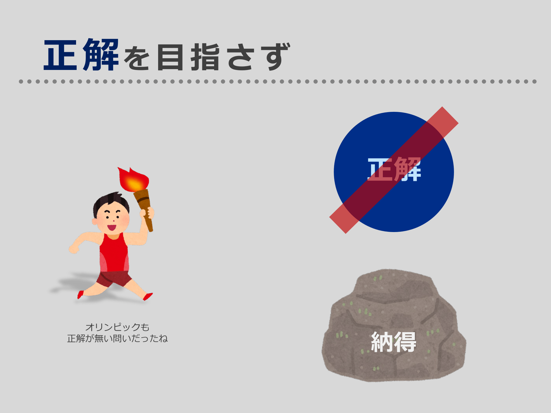 #7. 正解を目指さず納得を目指す 正解 オリンピックも 正解が無い問いだったね 納得