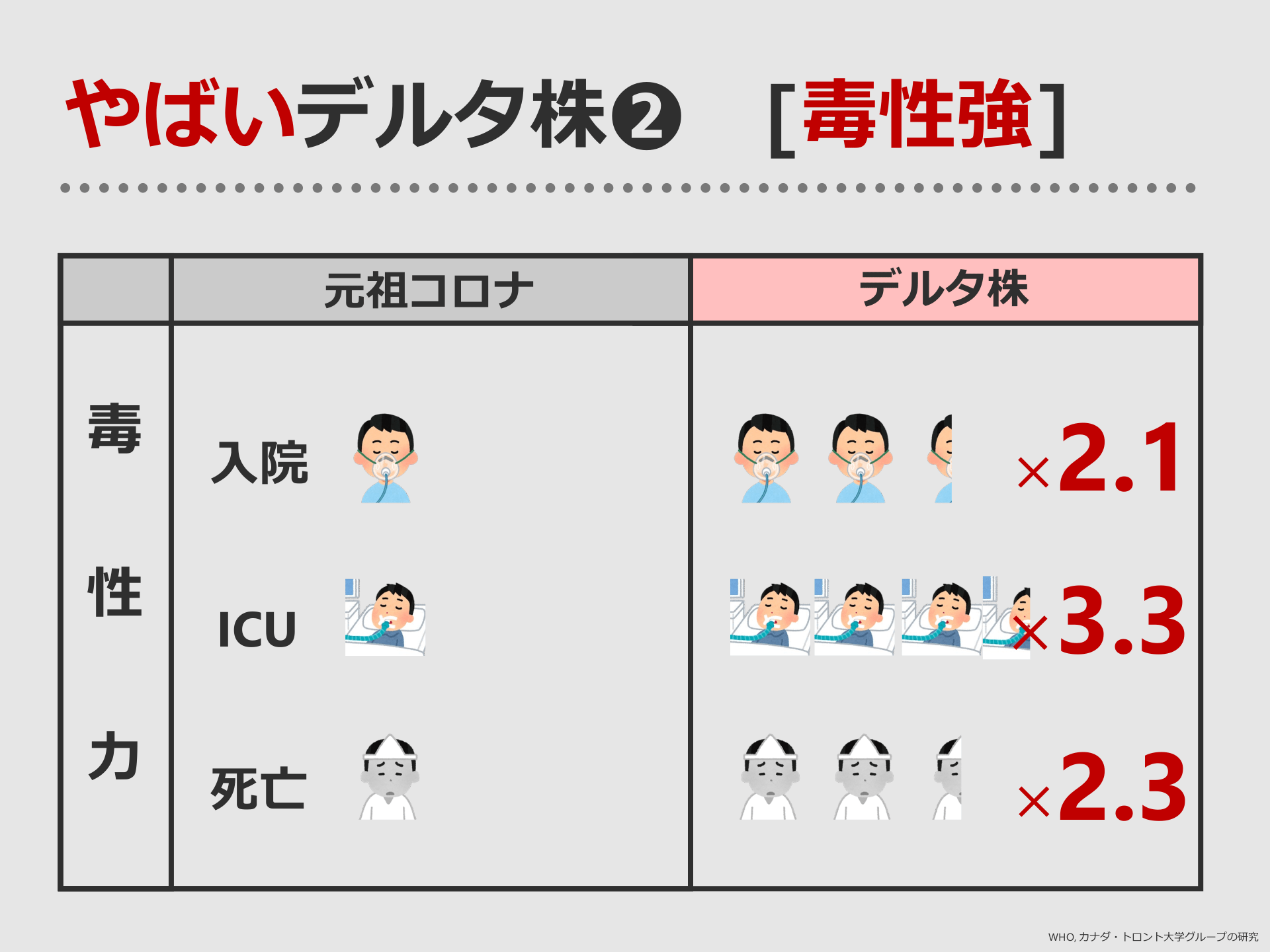 #70. やばいデルタ株❷ 元祖コロナ [毒性強] デルタ株 毒 2.1 × ICU ×3.3 死亡 × 性 入院 力 2.3 WHO, カナダ・トロント大学グループの研究