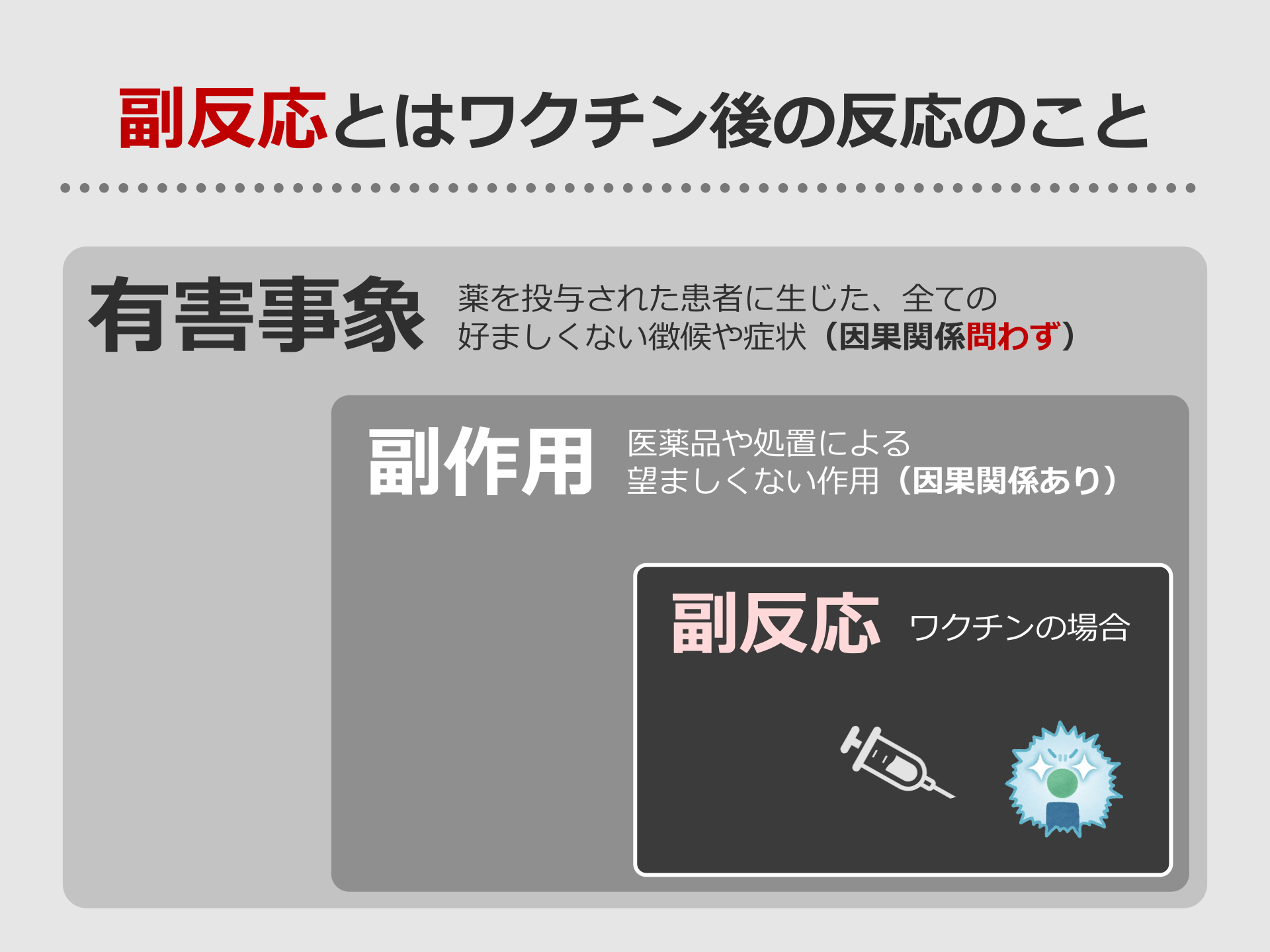 #73. 副反応とはワクチン後の反応のこと 有害事象 薬を投与された患者に生じた、全ての 好ましくない徴候や症状(因果関係問わず) 副作用 医薬品や処置による 望ましくない作用(因果関係あり) 副反応 ワクチンの場合