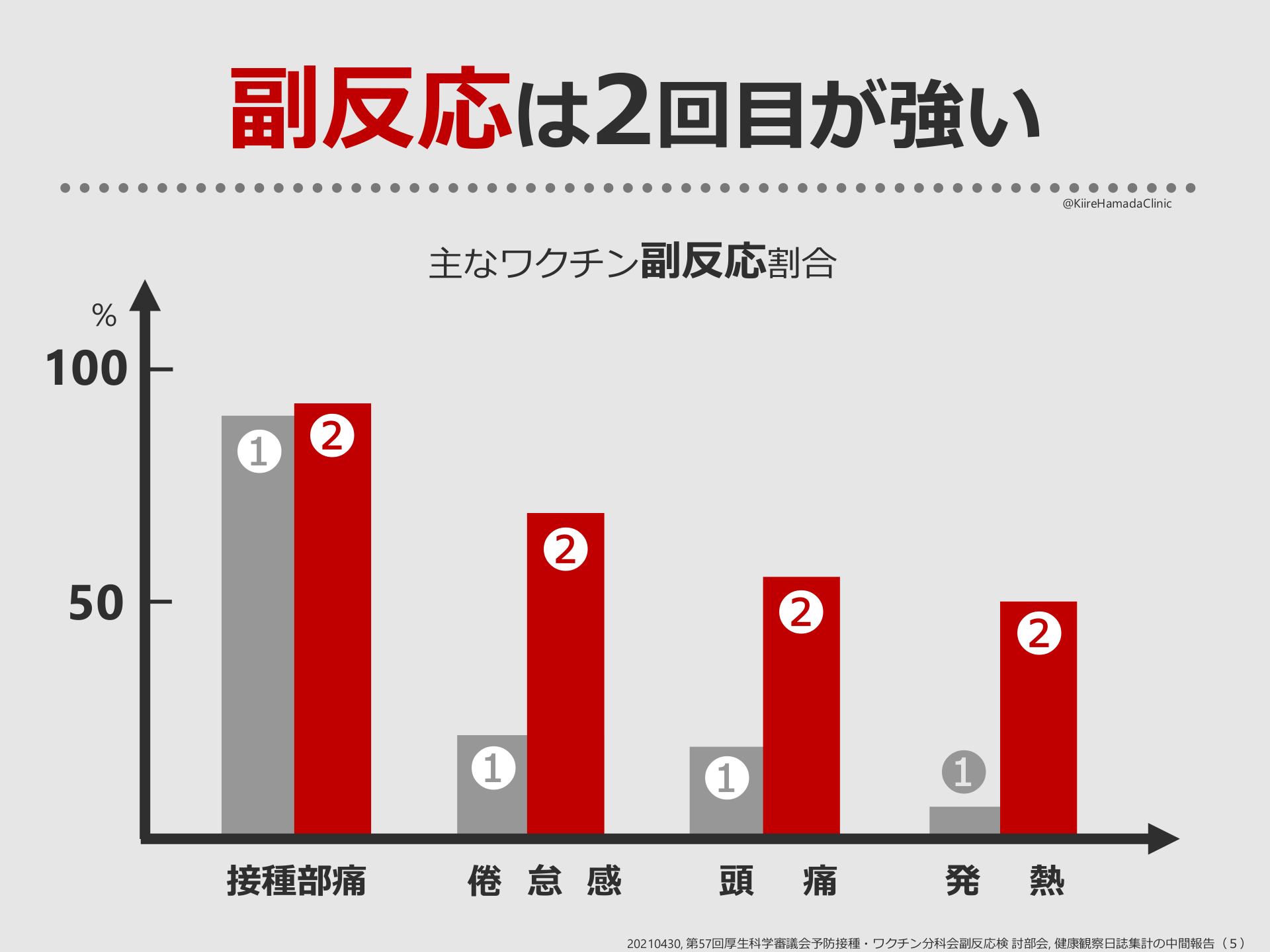 #74. 副反応は2回目が強い @KiireHamadaClinic 主なワクチン副反応割合 % 100 ❶ ❷ ❷ 50 ❶ 接種部痛 倦 怠 感 ❷ ❶ ❶ 頭 ❷ 痛 発 熱 20210430, 第57回厚生科学審議会予防接種・ワクチン分科会副反応検 討部会, 健康観察日誌集計の中間報告(5)