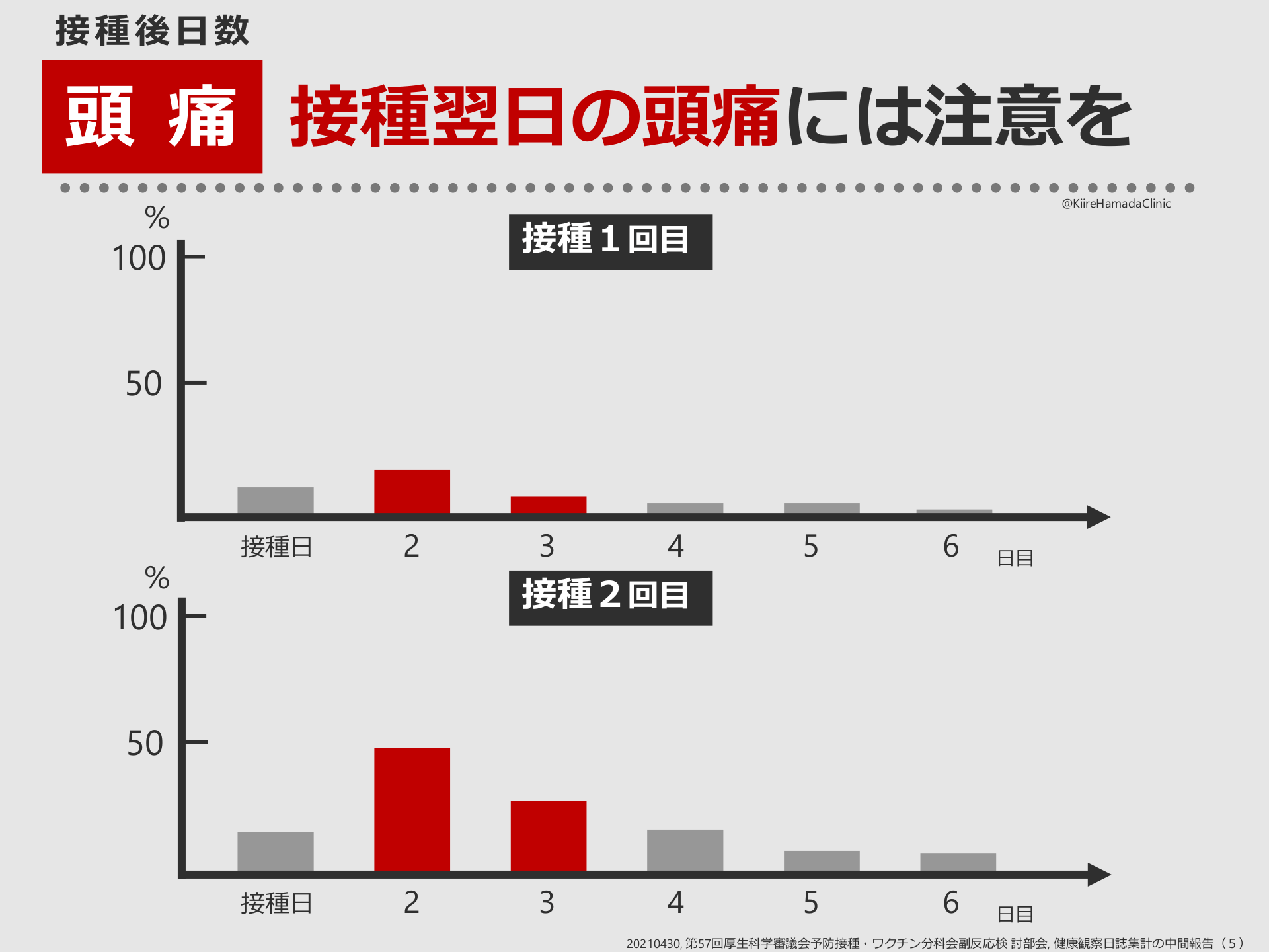 #76. 接種後日数 頭 痛 接種翌日の頭痛には注意を % @KiireHamadaClinic 接種1回目 100 50 % 接種日 2 100 3 4 5 6 日目 3 4 5 6 日目 接種2回目 50 接種日 2 20210430, 第57回厚生科学審議会予防接種・ワクチン分科会副反応検 討部会, 健康観察日誌集計の中間報告(5)