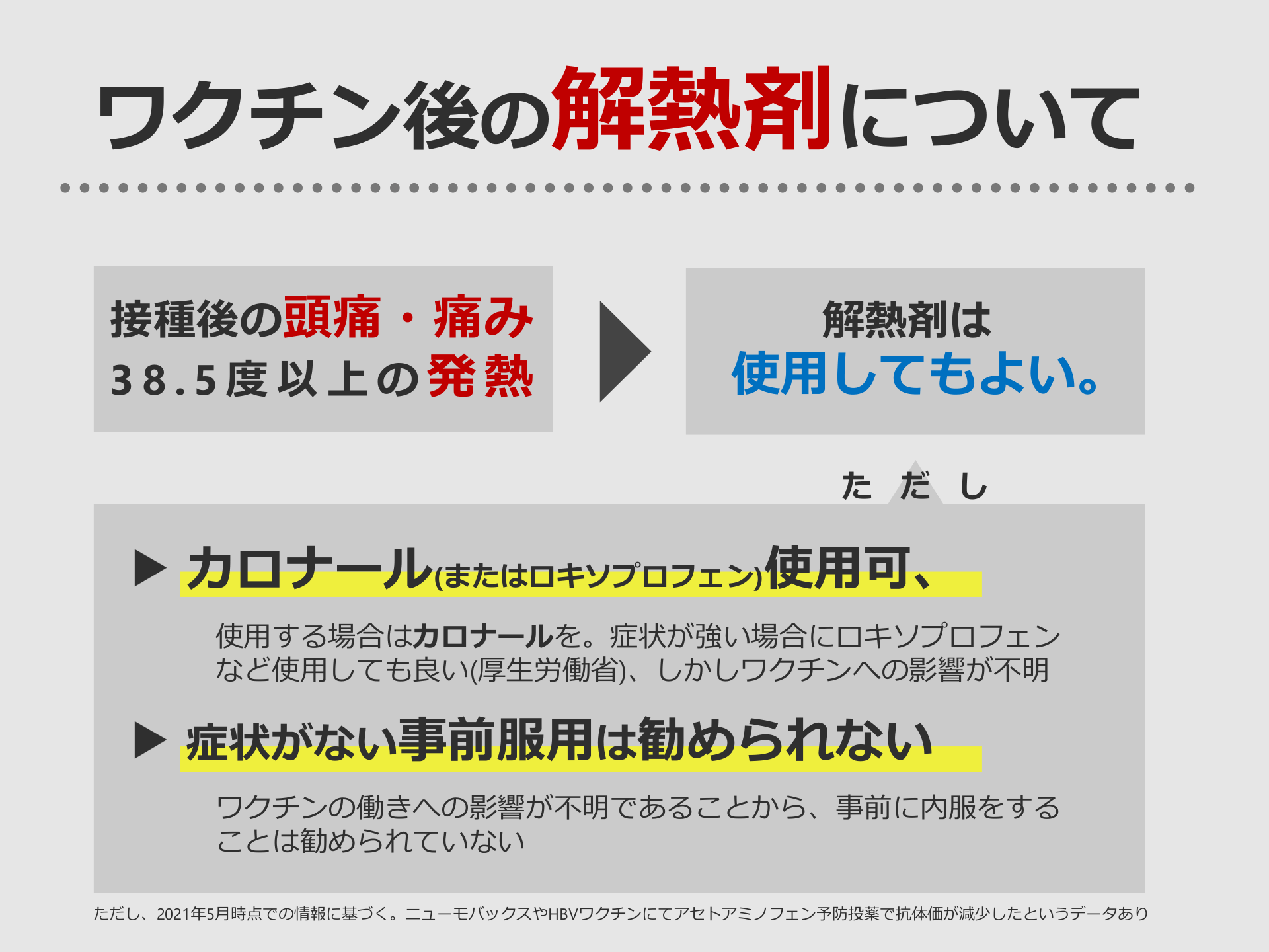 #78. ワクチン後の解熱剤について 接種後の頭痛・痛み 38.5度以上の発熱 解熱剤は 使用してもよい。 た だ し カロナール(またはロキソプロフェン)使用可、 使用する場合はカロナールを。症状が強い場合にロキソプロフェン など使用しても良い(厚生労働省)、しかしワクチンへの影響が不明 症状がない事前服用は勧められない ワクチンの働きへの影響が不明であることから、事前に内服をする ことは勧められていない ただし、2021年5月時点での情報に基づく。ニューモバックスやHBVワクチンにてアセトアミノフェン予防投薬で抗体価が減少したというデータあり