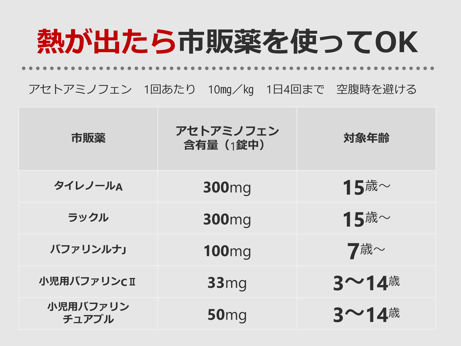 #79. 熱が出たら市販薬を使ってOK アセトアミノフェン 1回あたり 10㎎/㎏ 1日4回まで 空腹時を避ける 市販薬 アセトアミノフェン 含有量(1錠中) 対象年齢 タイレノールA 300mg 15歳~ ラックル 300mg バファリンルナJ 100mg 小児用バファリンCⅡ 33mg 小児用バファリン チュアブル 50mg 15歳~ 7歳~ 3~14歳 3~14歳