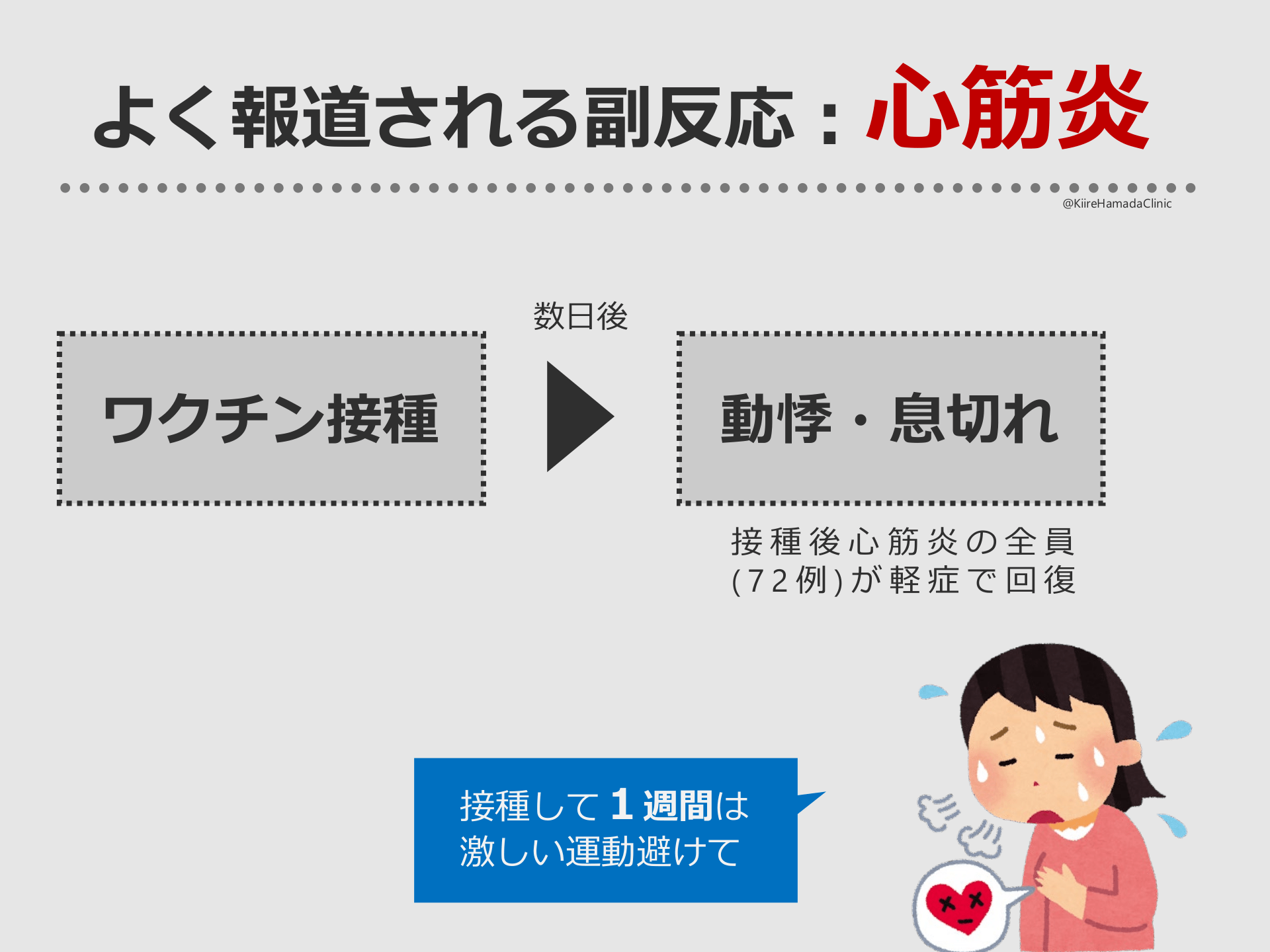 #81. よく報道される副反応:心筋炎 @KiireHamadaClinic 数日後 ワクチン接種 動悸・息切れ 接種後心筋炎の全員 (72例)が軽症で回復 接種して1週間は 激しい運動避けて