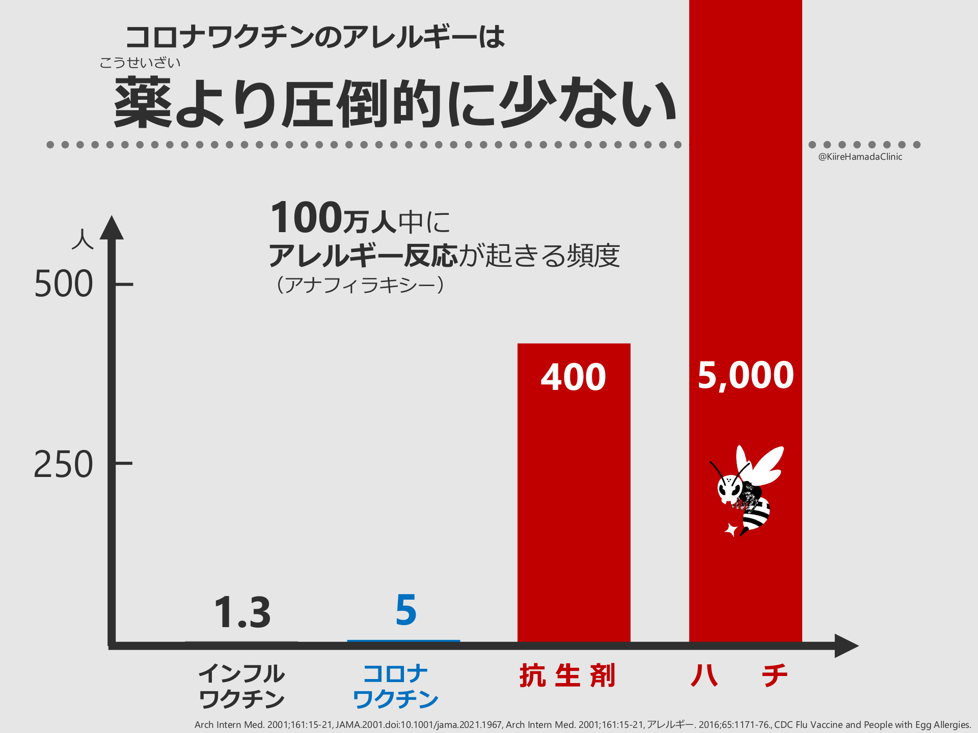 #84. コロナワクチンのアレルギーは こうせいざい 薬より圧倒的に少ない 人 500 @KiireHamadaClinic 100万人中に アレルギー反応が起きる頻度 (アナフィラキシー) 400 5,000 250 1.3 インフル ワクチン 5 コロナ ワクチン 抗生剤 ハ チ Arch Intern Med. 2001;161:15-21, JAMA.2001.doi:10.1001/jama.2021.1967, Arch Intern Med. 2001;161:15-21, アレルギー. 2016;65:1171-76., CDC Flu Vaccine and People with Egg Allergies.