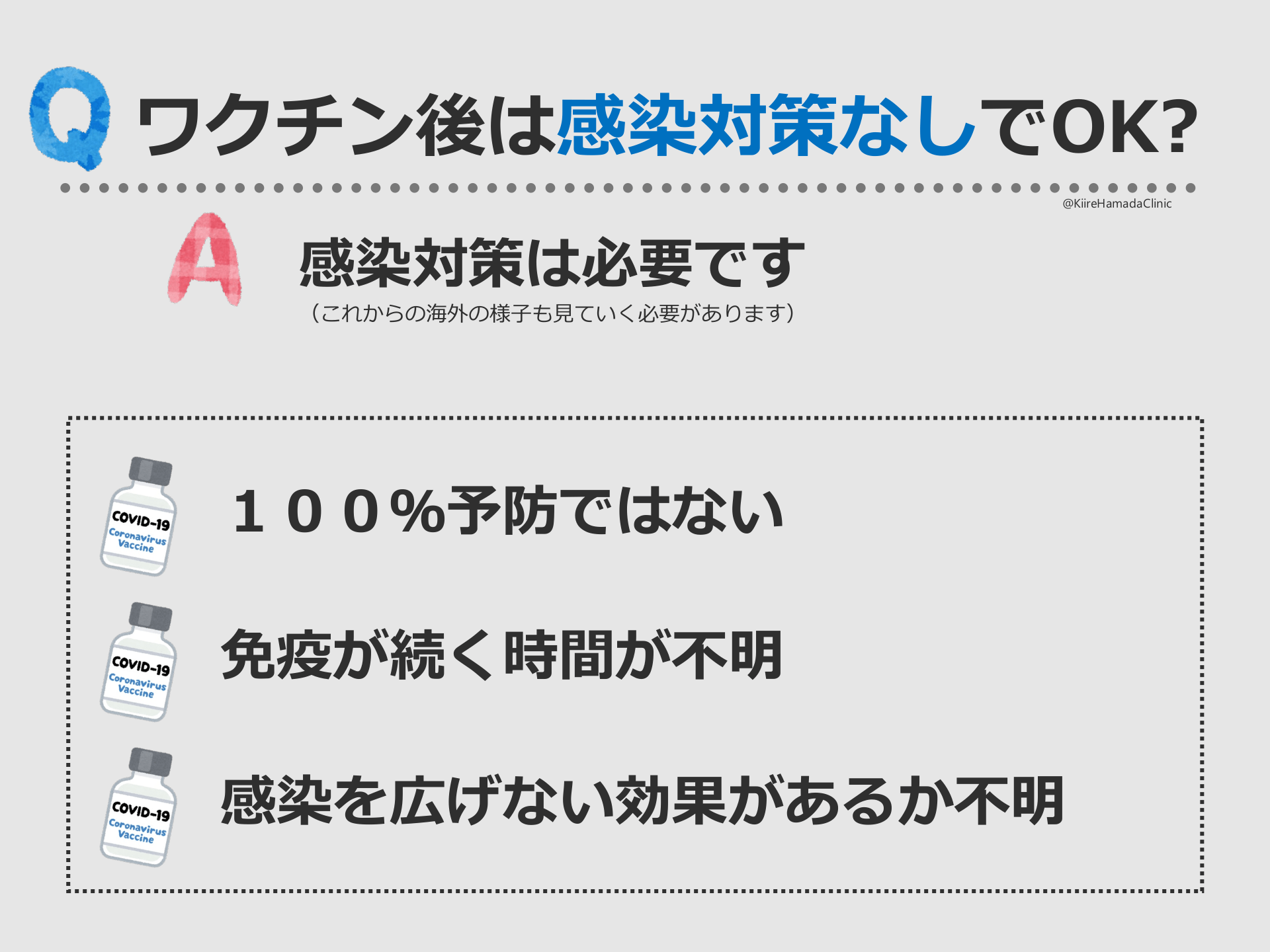 #88. ワクチン後は感染対策なしでOK? @KiireHamadaClinic 感染対策は必要です (これからの海外の様子も見ていく必要があります) 100%予防ではない 免疫が続く時間が不明 感染を広げない効果があるか不明