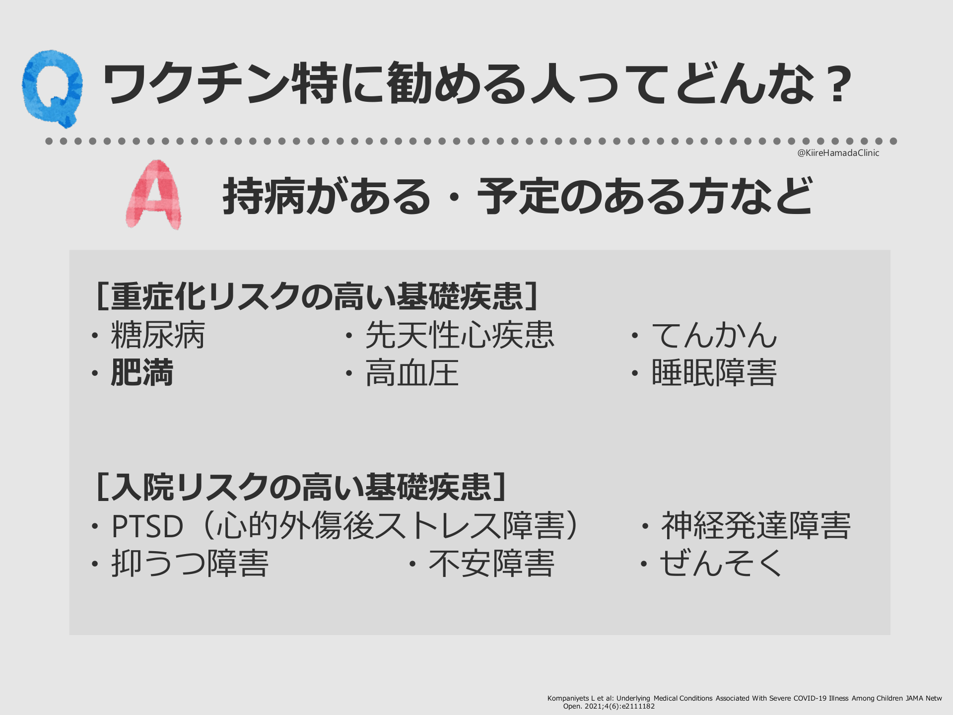 #91. ワクチン特に勧める人ってどんな? @KiireHamadaClinic 持病がある・予定のある方など [重症化リスクの高い基礎疾患] ・糖尿病 ・先天性心疾患 ・肥満 ・高血圧 ・てんかん ・睡眠障害 [入院リスクの高い基礎疾患] ・PTSD(心的外傷後ストレス障害) ・神経発達障害 ・抑うつ障害 ・不安障害 ・ぜんそく Kompaniyets L et al: Underlying Medical Conditions Associated With Severe COVID-19 Illness Among Children JAMA Netw Open. 2021;4(6):e2111182