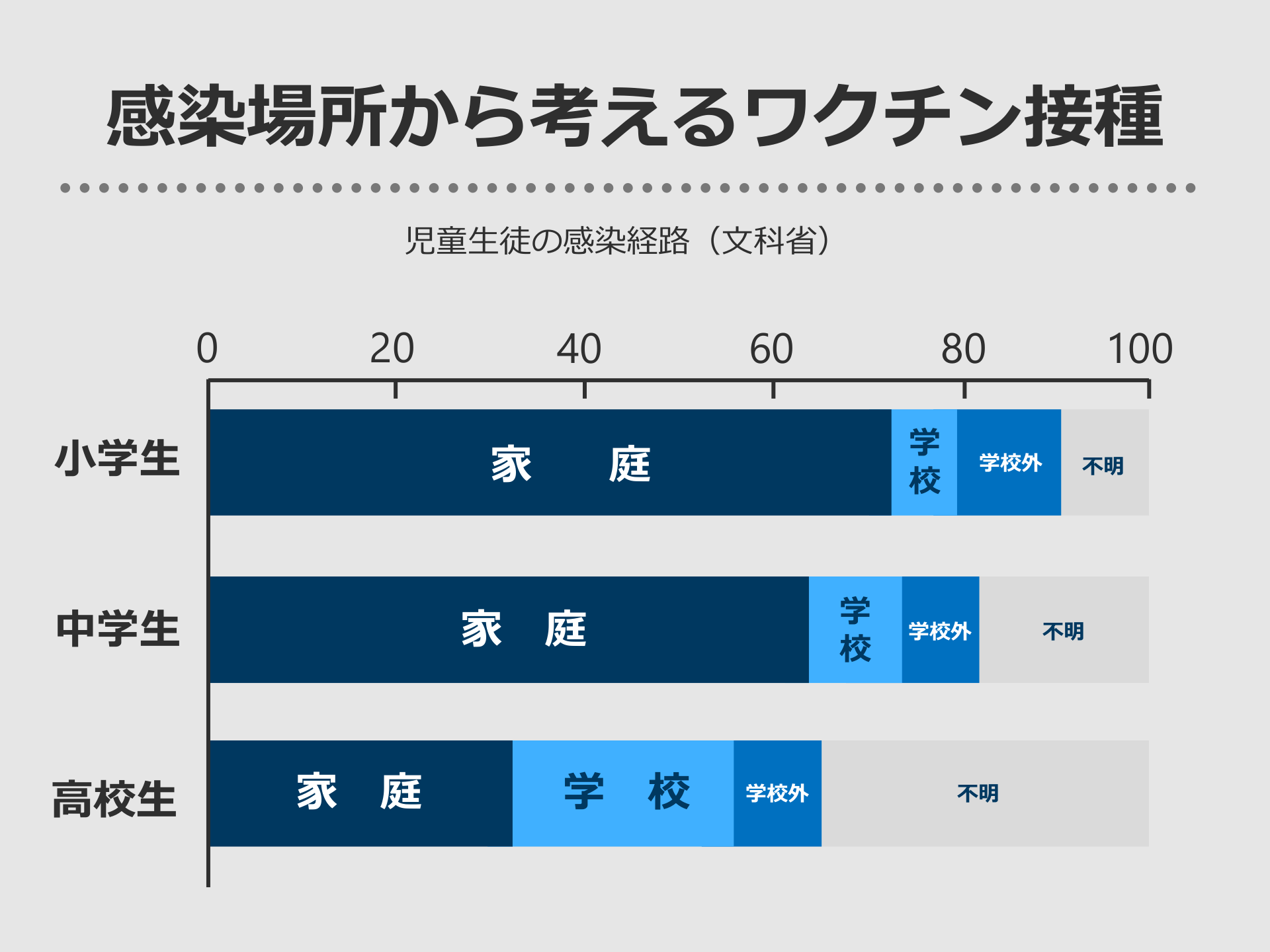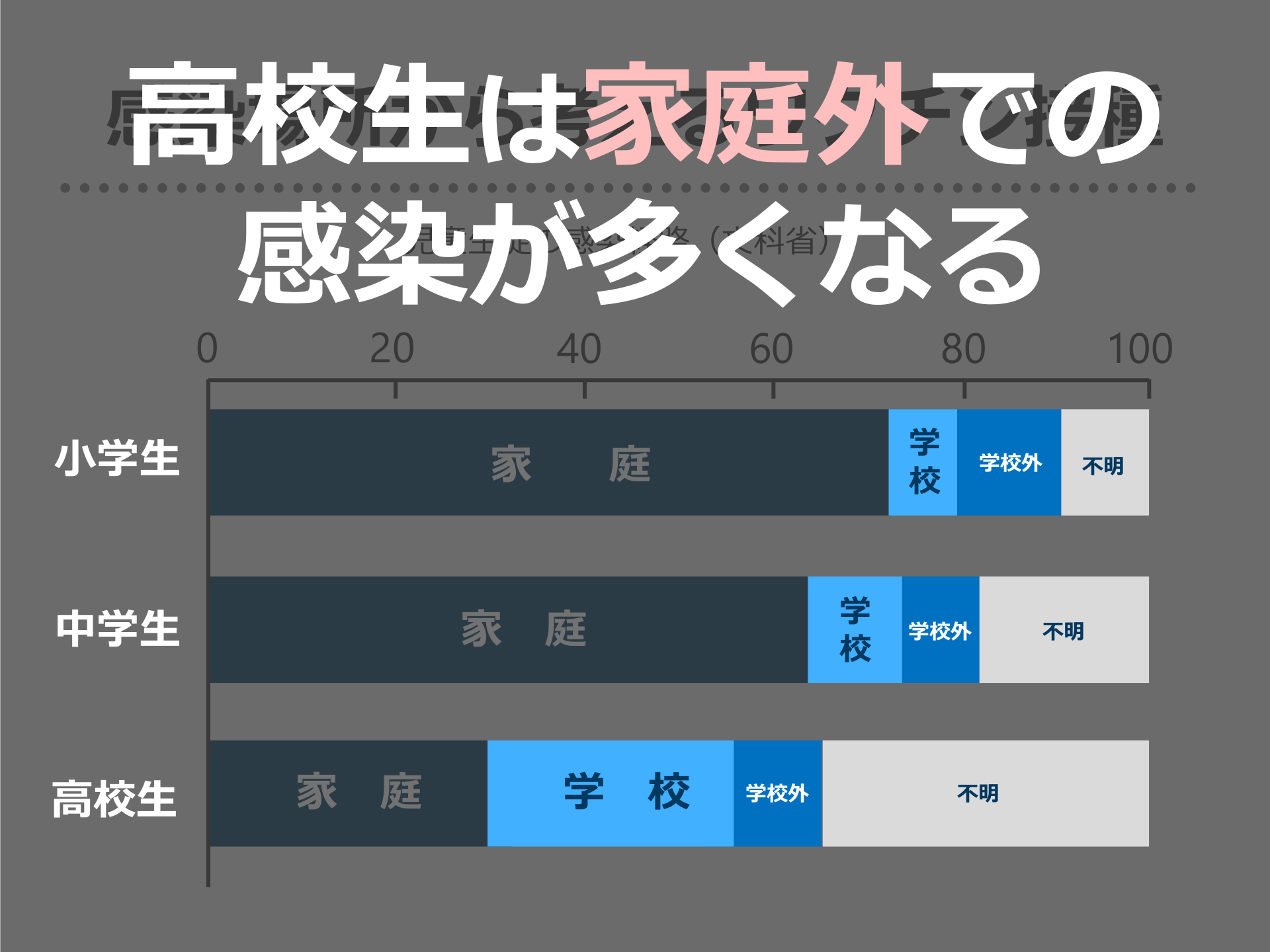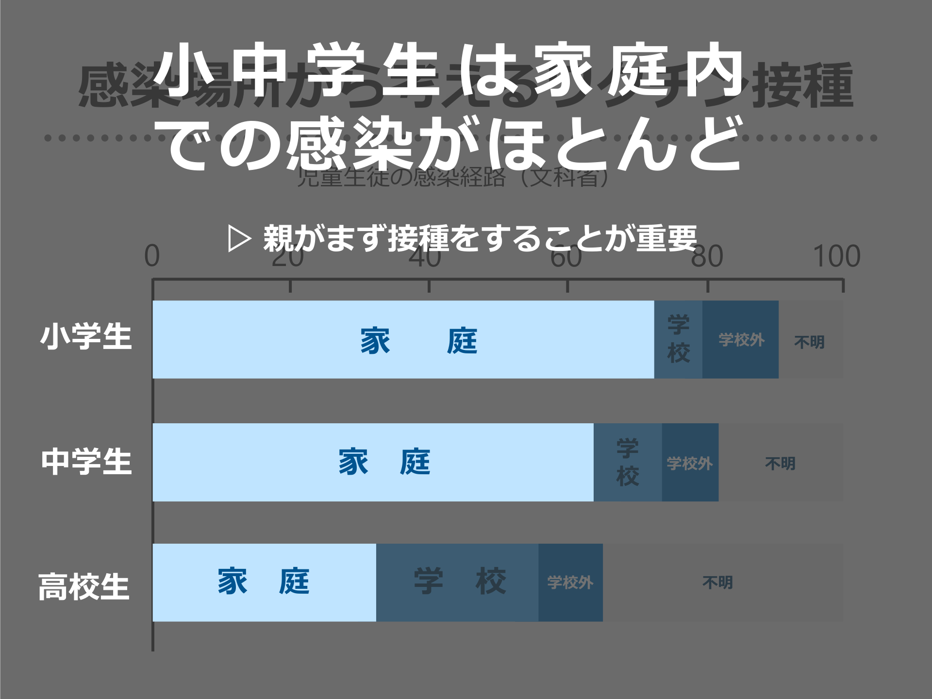 #94. 高校生 家庭外での 感染が多くなる 感染場所から考えるワクチン接種 は 児童生徒の感染経路(文科省) 20 0 小学生 家 中学生 高校生 40 家 家 庭 60 80 学 校 庭 学 校 庭 学 校 学校外 学校外 学校外 不明 100 不明 不明