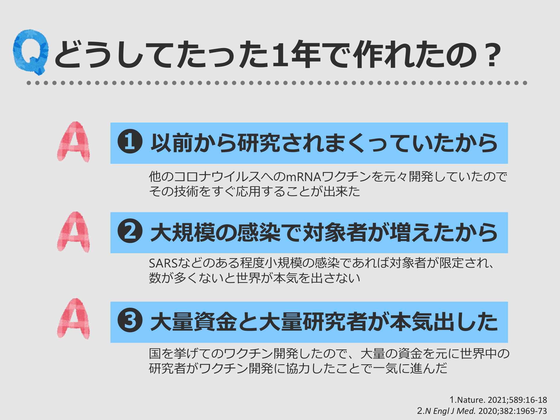#95. どうしてたった1年で作れたの? ❶ 以前から研究されまくっていたから 他のコロナウイルスへのmRNAワクチンを元々開発していたので その技術をすぐ応用することが出来た ❷ 大規模の感染で対象者が増えたから SARSなどのある程度小規模の感染であれば対象者が限定され、 数が多くないと世界が本気を出さない ❸ 大量資金と大量研究者が本気出した 国を挙げてのワクチン開発したので、大量の資金を元に世界中の 研究者がワクチン開発に協力したことで一気に進んだ 1.Nature. 2021;589:16-18 2.N Engl J Med. 2020;382:1969-73
