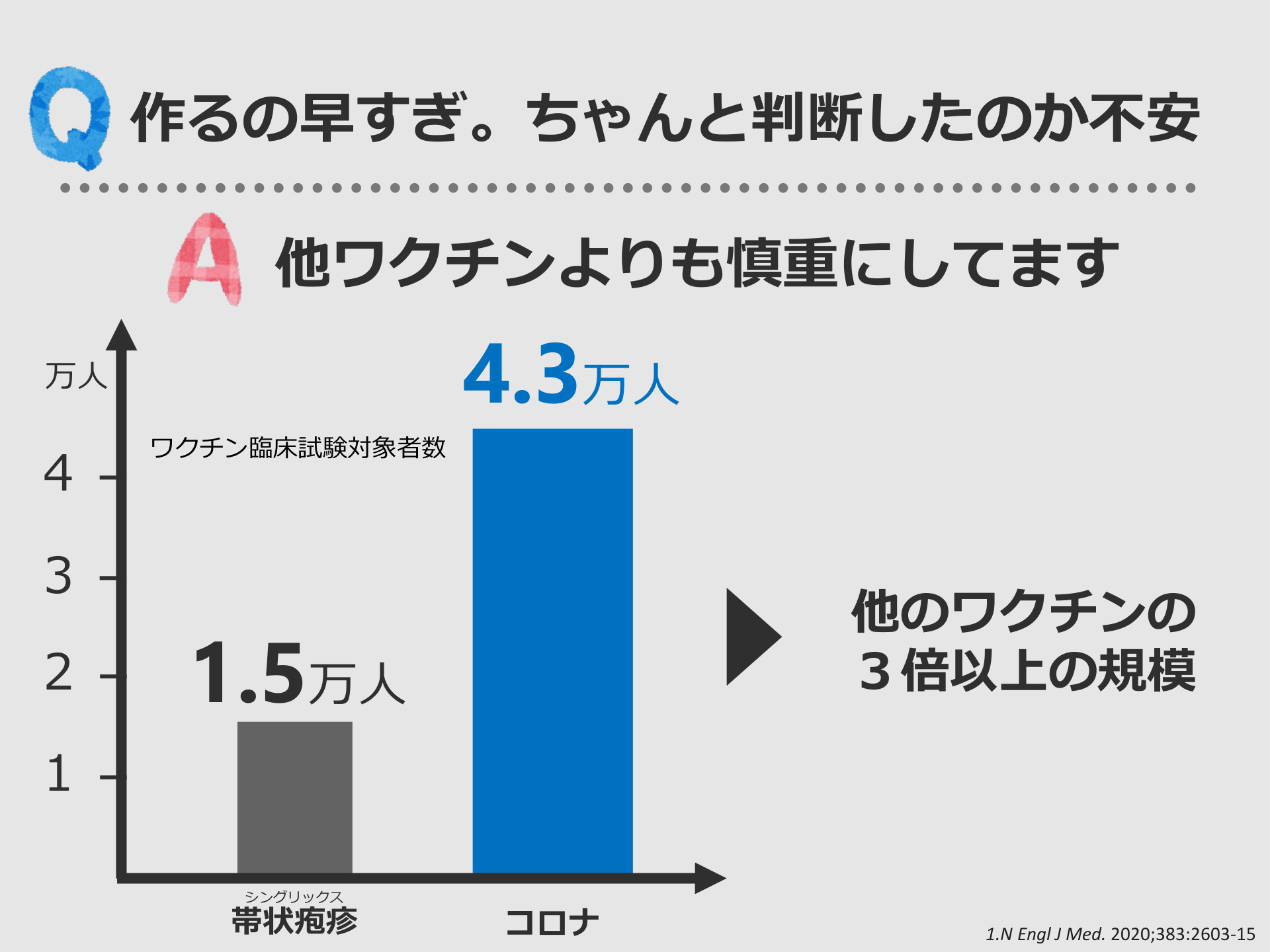 #96. 作るの早すぎ。ちゃんと判断したのか不安 他ワクチンよりも慎重にしてます 万人 4 3 2 1 ワクチン臨床試験対象者数 4.3万人 他のワクチンの 3倍以上の規模 1.5万人 シングリックス 帯状疱疹 コロナ 1.N Engl J Med. 2020;383:2603-15