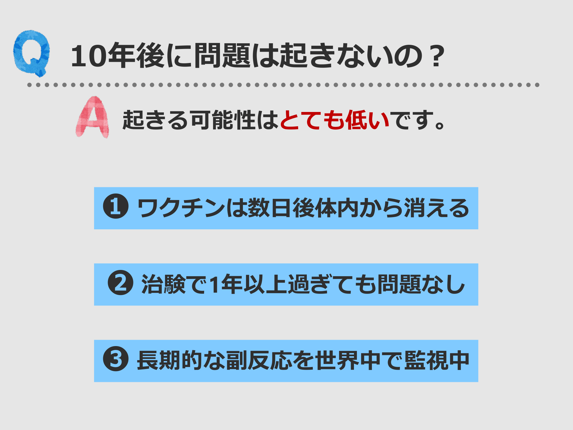#97. 10年後に問題は起きないの? 起きる可能性はとても低いです。 ❶ ワクチンは数日後体内から消える ❷ 治験で1年以上過ぎても問題なし ❸ 長期的な副反応を世界中で監視中
