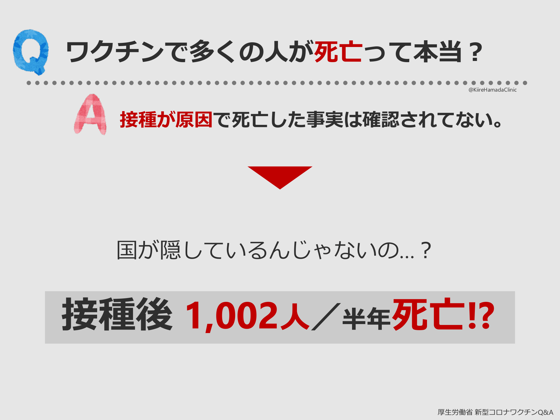 #98. ワクチンで多くの人が死亡って本当? @KiireHamadaClinic 接種が原因で死亡した事実は確認されてない。 国が隠しているんじゃないの…? 接種後 1,002人/半年死亡!? 厚生労働省 新型コロナワクチンQ&A