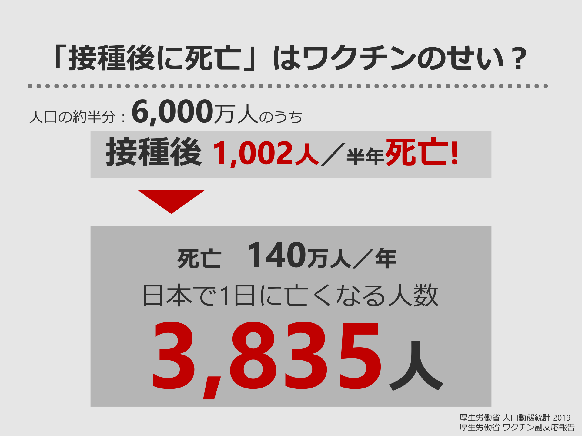 #99. 「接種後に死亡」はワクチンのせい? 6,000万人のうち 接種後 1,002人/半年死亡! 人口の約半分: 死亡 140万人/年 3,835人 日本で1日に亡くなる人数 厚生労働省 人口動態統計 2019 厚生労働省 ワクチン副反応報告